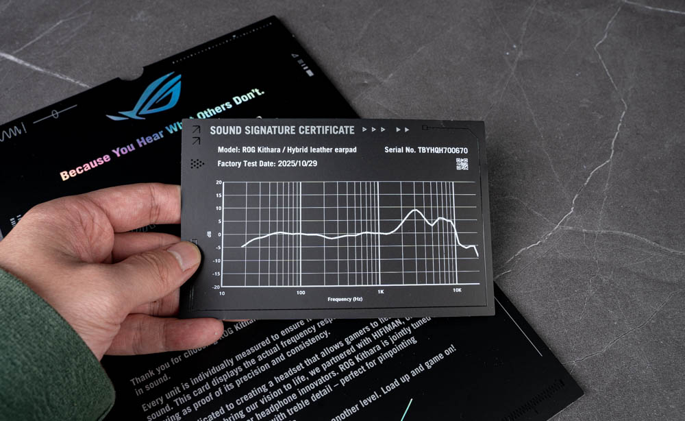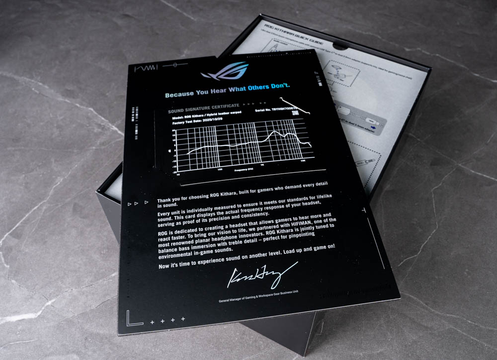 打開外盒後,最上方有兩張文件。其中一張為耳機的音效特徵測試結果卡,上面印有專屬序號與對應的頻率響應曲線,強調每一副耳機皆經過個別量測與校準,帶來一定程度的專屬感與品質保障,同時也說明了 ROG 與 HIFIMAN 的合作理念,點出 Kithara 在低頻厚度與高頻細節之間所追求的平衡聲學取向。