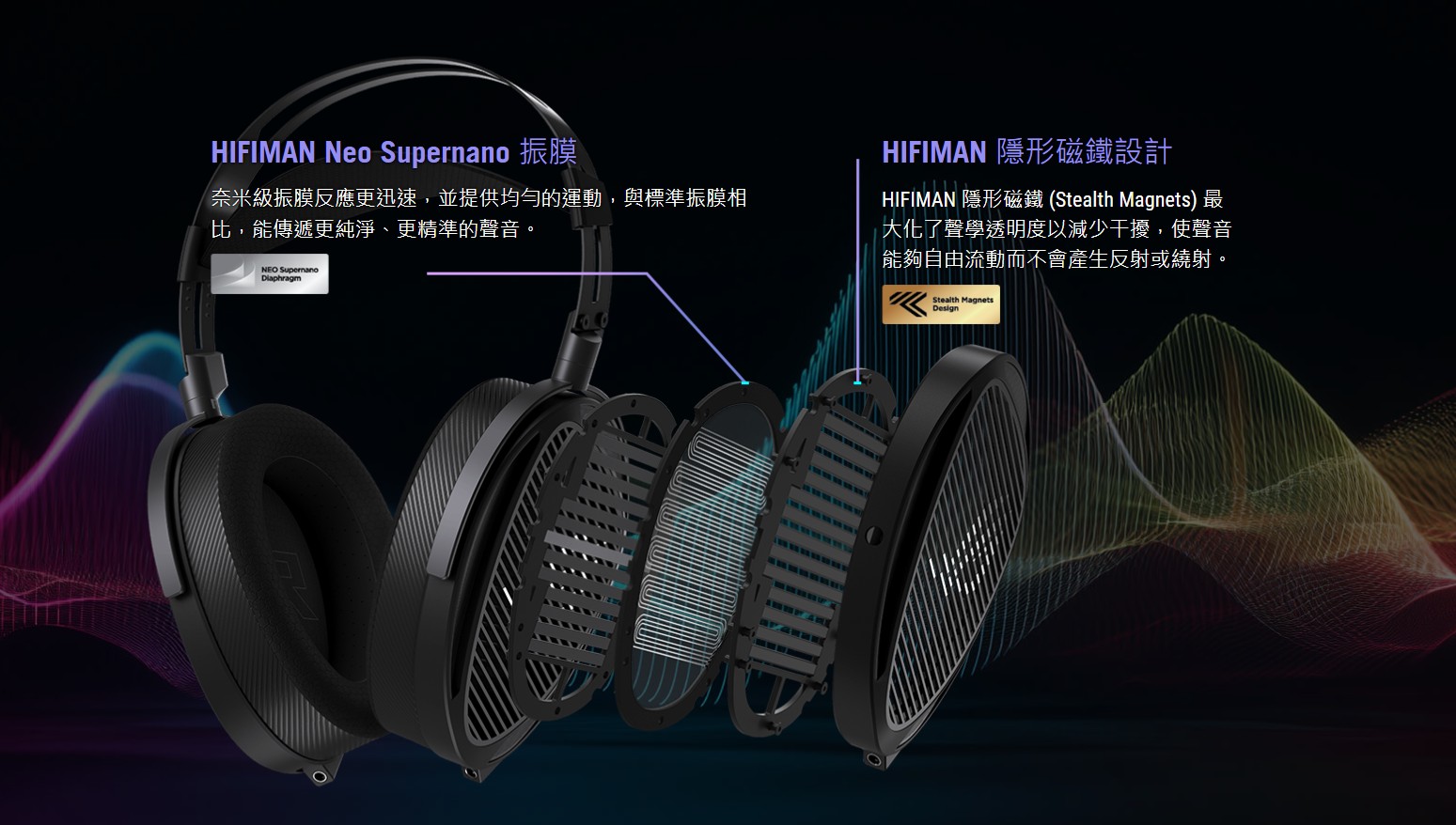 除了奈米級振膜本身的優勢外,Kithara 亦導入 HIFIMAN 的 Stealth Magnets 隱形磁鐵設計。此結構透過優化磁鐵形狀與排列方式,降低聲波在磁鐵結構間的反射與繞射干擾,提升聲學透明度,使聲音傳遞更為自然流暢。