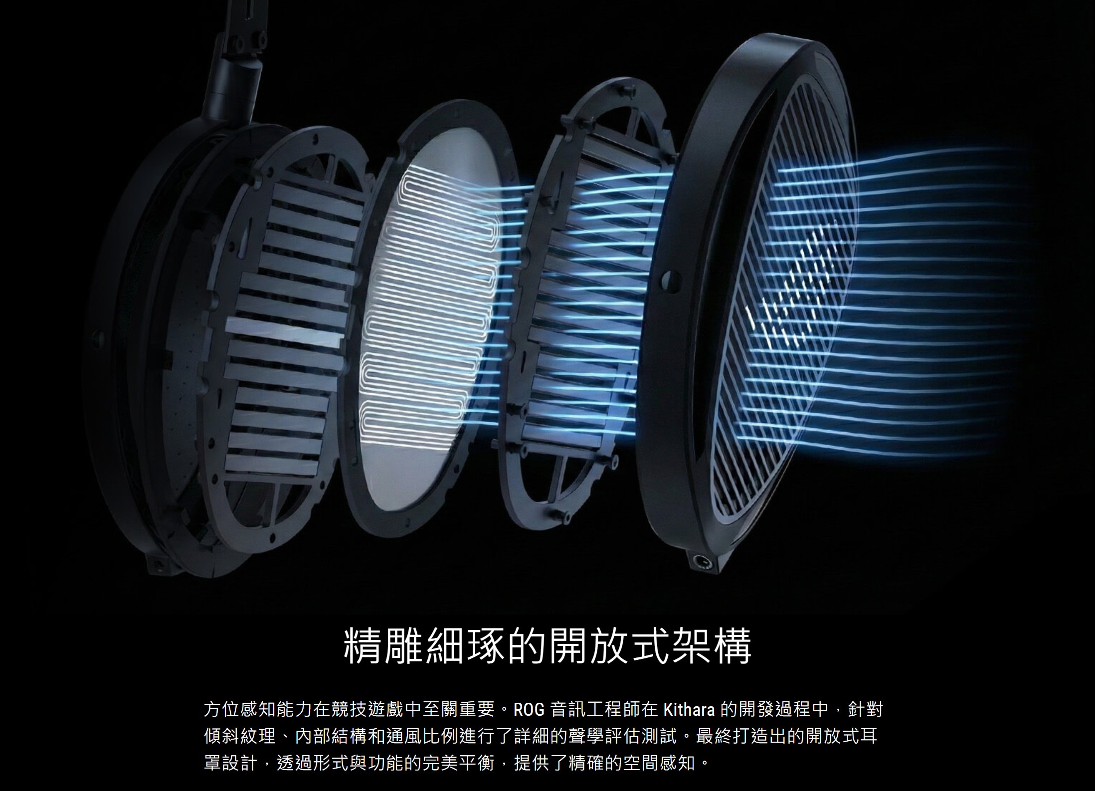 這樣的外觀設計並非只是為了視覺效果,ROG Kithara 在聲學結構上同樣投入大量心力。透過針對單體傾斜角度、內部結構配置與通風比例進行細緻的聲學測試與調校,最終打造出這套開放式架構。