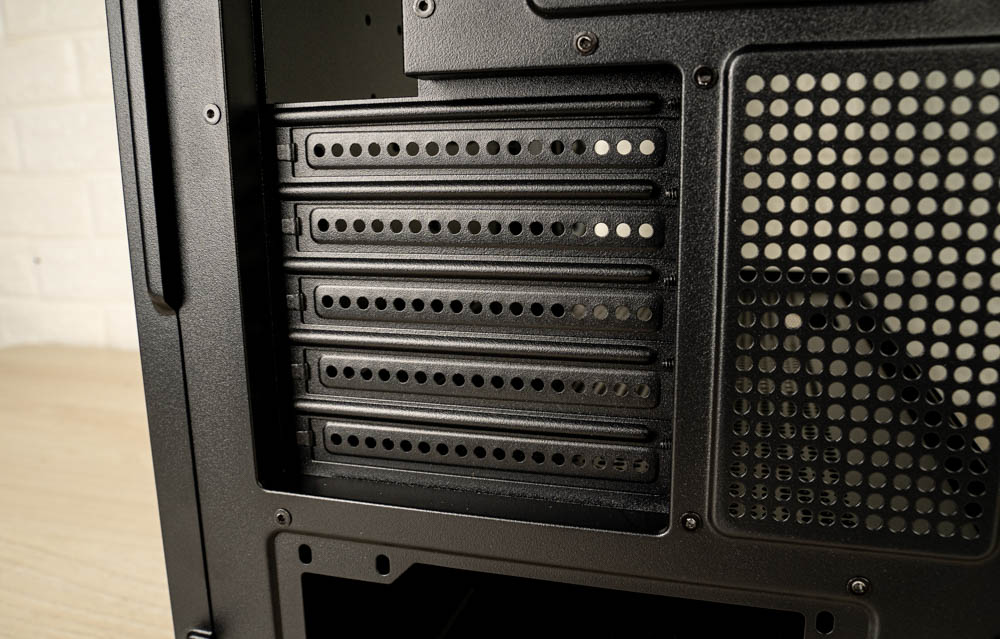 PCIe 擴充槽部分提供五個槽位,可完整對應標準 M-ATX 主機板的擴充需求,無論是顯示卡或其他擴充卡安裝都相當充裕。下方則為電源艙位置,採獨立分艙設計,有助於將電源與主要硬體區域分隔,降低熱源干擾,同時也讓整體理線更為整潔。