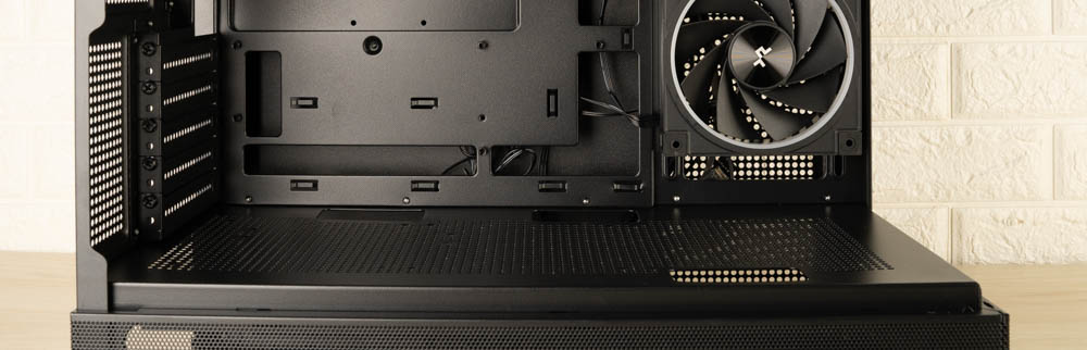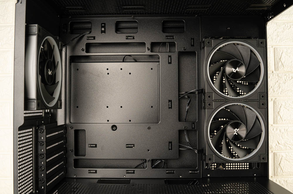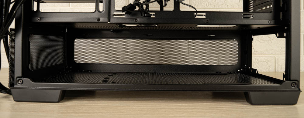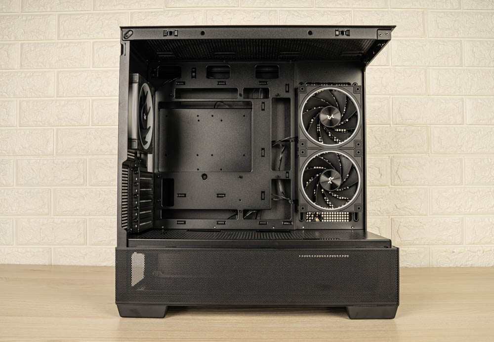 電源艙上方區域採用大面積開孔設計,同時預留三組風扇安裝孔位,最多可在此額外安裝三顆 120 mm 風扇,形成由下往上的垂直進風氣流,加強顯示卡區域的散熱表現。