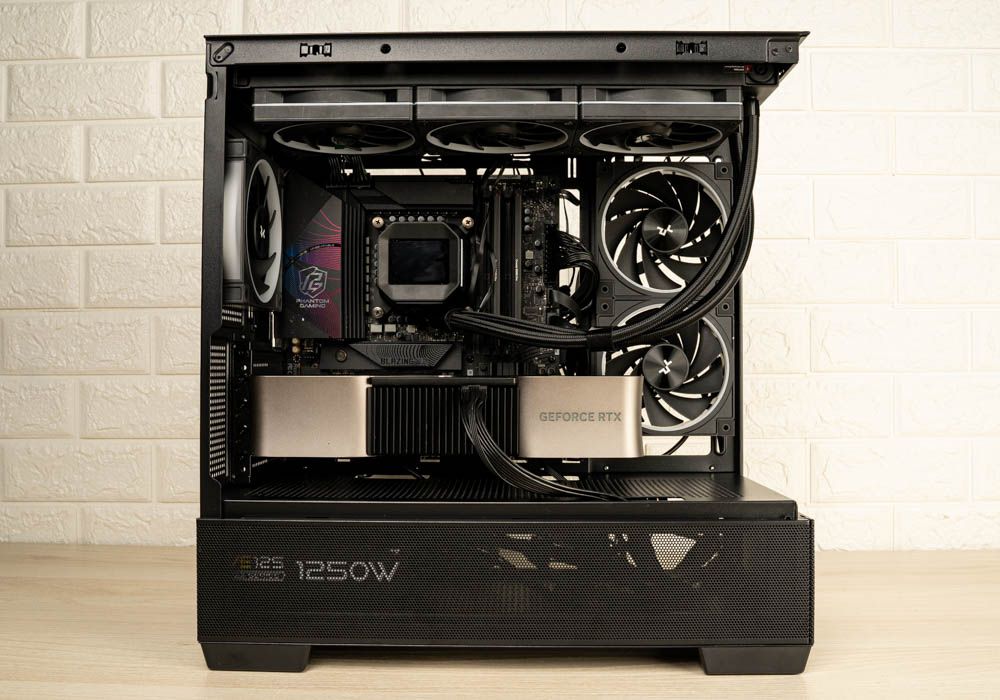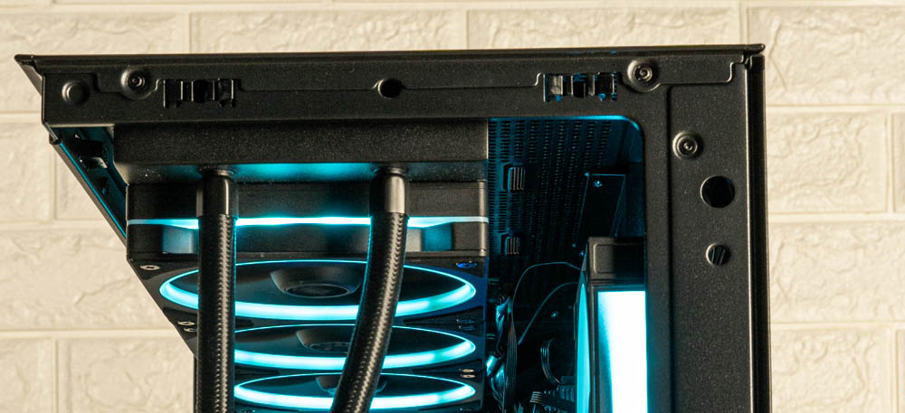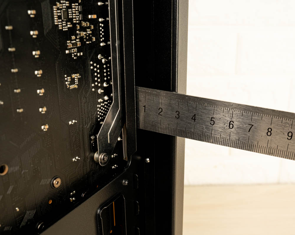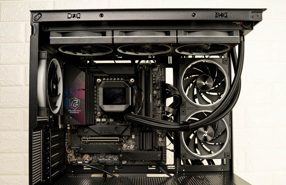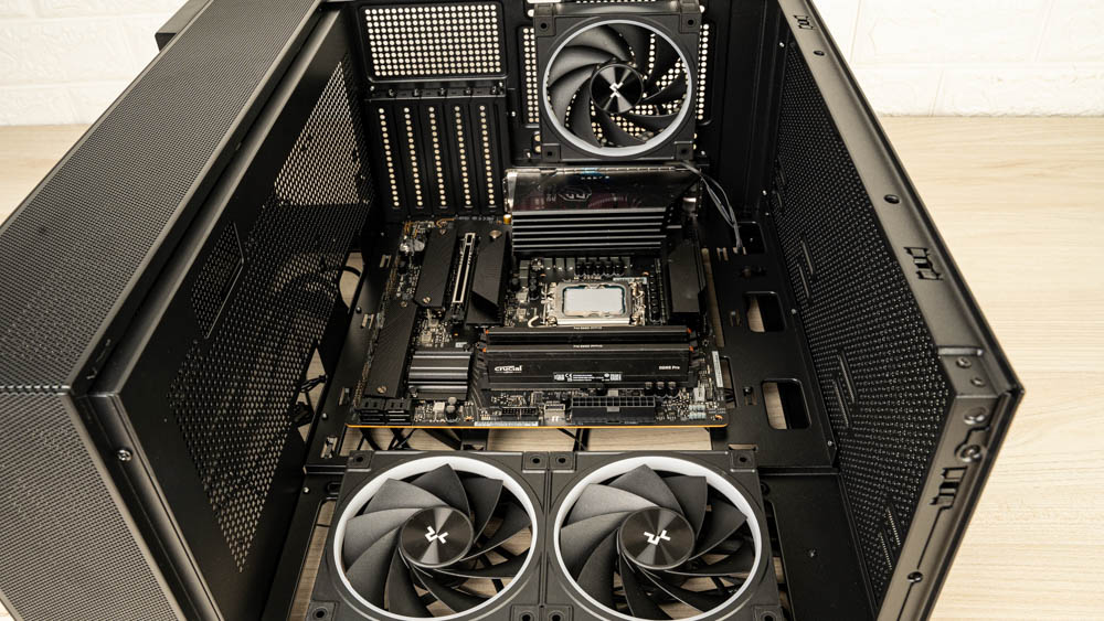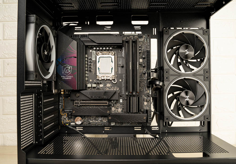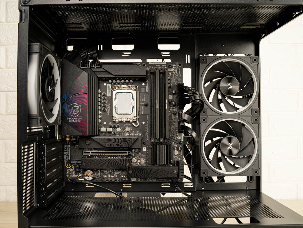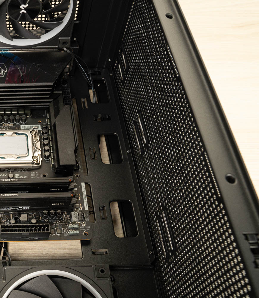 同時可以看到主機板上緣與頂部之間保留了相當充裕的間距,這樣的高度預留設計,不論是穿 CPU 供電線,或是安裝頂部水冷排,都能輕鬆完成,安裝過程不會有卡手或干涉的情況。