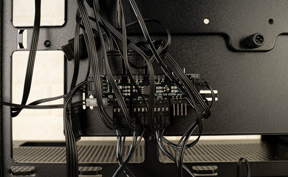 在主機板安裝區一側可看到原廠預裝的燈效控制器,最多可支援四組 ARGB 連接埠。出廠時已預先連接機殼內預裝的風扇,因此實際可額外使用的連接埠剩餘一組,可將其他 ARGB 裝置接入此控制器進行燈效同步。