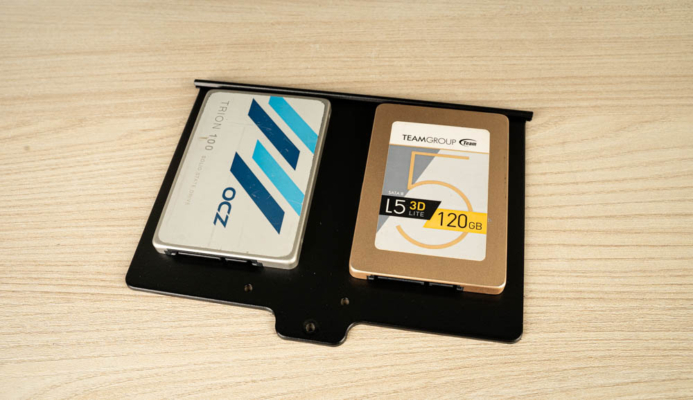 在主機板安裝區中央位置還設有一組硬碟架,可支援安裝兩顆 2.5 吋 SSD,或一顆 3.5 吋 HDD,提供基本的儲存擴充彈性。