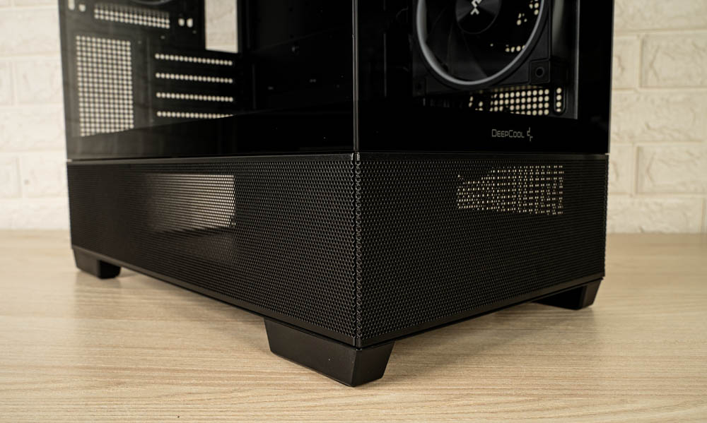 在機殼底部可看到四個加高的腳座設計,與桌面之間約保留 1.5 cm 的高度空間,有助於底部進風與整體散熱表現,底部也有大面積防塵網。