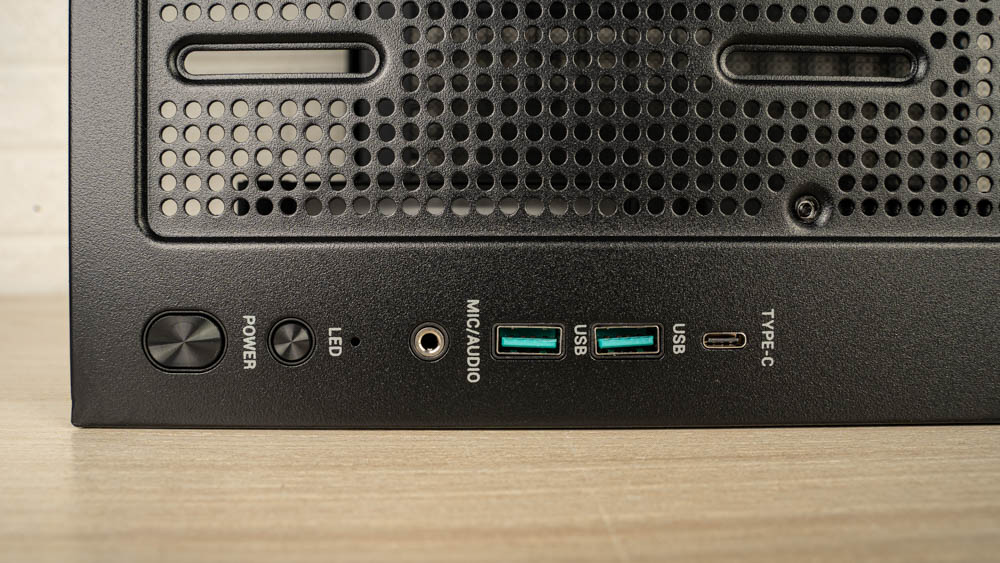 I/O 介面設置於機殼頂部,包含一組 USB Type-C、兩組 USB 3.0、燈效控制鍵、一組音源複合孔,以及電源開關鍵。