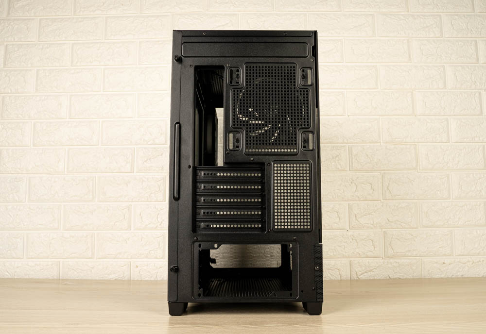 不過在搭配 M-ATX 主機板時,顯示卡的 PCIe 插槽位置會落在機殼擴充槽的第二格。若安裝體積較大的三槽高階顯示卡,實際空間可能會與下方風扇產生干涉;若使用雙槽顯示卡則不會有影響。