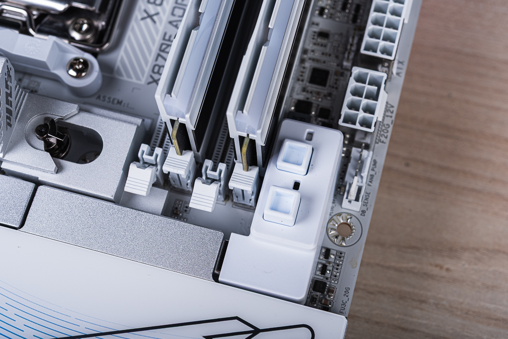 走在 DIY 友善的最前端,技嘉的主機板讓玩家在 DIY 組裝時無須使用任何工具即可輕鬆完工。首先主板的 2 根 PCIe 5.0 x16 插槽,使用新的「PCIe EZ-Latch+ Duo」友善設計,在主機板右側多了 2 顆白色方形的實體按鈕,可以用來控制 PCIe 插槽的上鎖、釋放的兩個狀態。