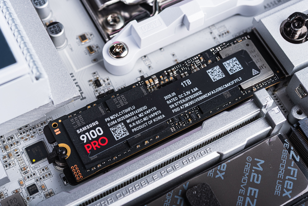 系統碟使用 SAMSUNG 9100 PRO 1TB SSD,採用 PCIe 5.0 x4 頻寬,可達到連續讀寫 14,800 MB/s、13,400 MB/s 的高傳輸效能。特別的是,SSD 背面貼有散熱片標籤,可以替快閃記憶體顆粒、快取晶片透過背面散熱,而表面的控制器則有鍍鎳塗層,需搭配主板 M.2 散熱片。