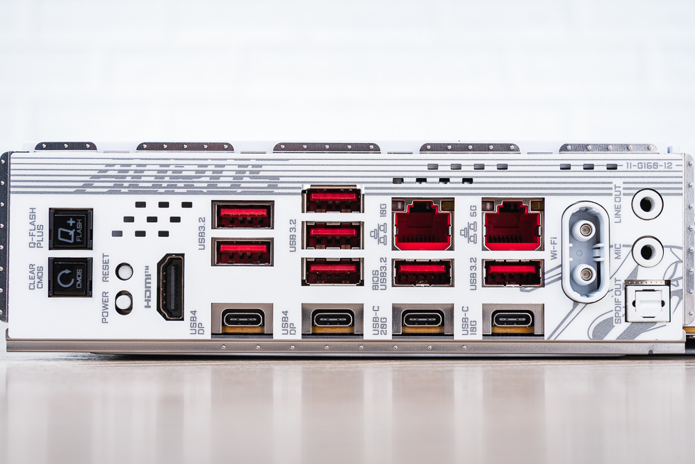 USB 則包含 2 個 USB4 Type-C(支援 DP 輸出),還有 1 個 USB-C 20Gbps、1 個 USB-C 10Gbps,以及 6 個 USB 3.2 Gen 2 在算上主板擴充總共有著 19 個可用 USB。而 RJ-45 則有 10GbE 與 5GbE 兩個,還有 WIFI EZ-Plug 的天線快拆設計;音效則是基本 3.5mm 輸出、輸入與 SPDIF 輸出。