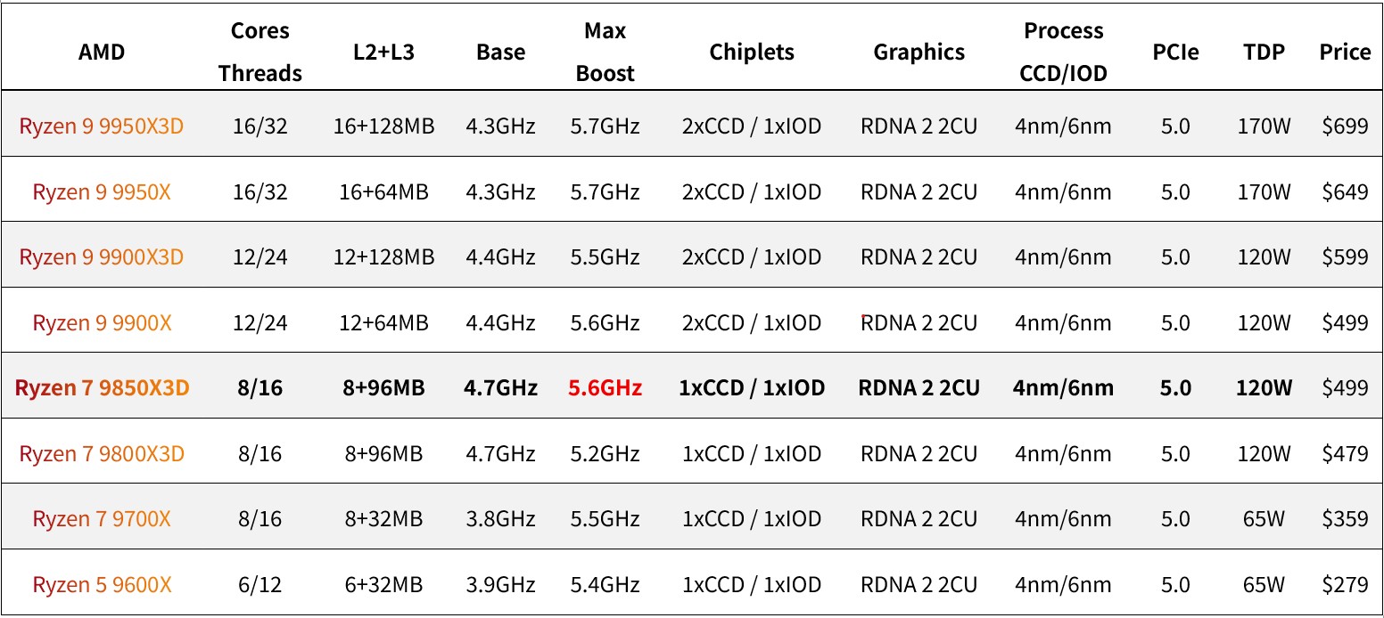 Zen 5 + X3D 最佳組合!AMD 還未急著更新 Zen 6 新架構,持續堆疊第二代 3D V-Cache,推出時脈更高的「AMD Ryzen 7 9850X3D」處理器,規格與 9800X3D 相同,具備 8 核心 16 執行緒、L2 + L3 高達 104MB 快取、同樣 120W TDP 熱功耗,並且最大 Boost 時脈提升至 5.6GHz,持續穩坐最強遊戲處理器寶座。