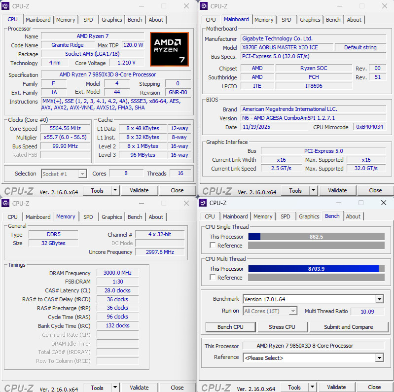 主機板:X870E AORUS MASTER X3D ICE、BIOS N6、AMD AGESA ComboAm5PI 1.2.7.1