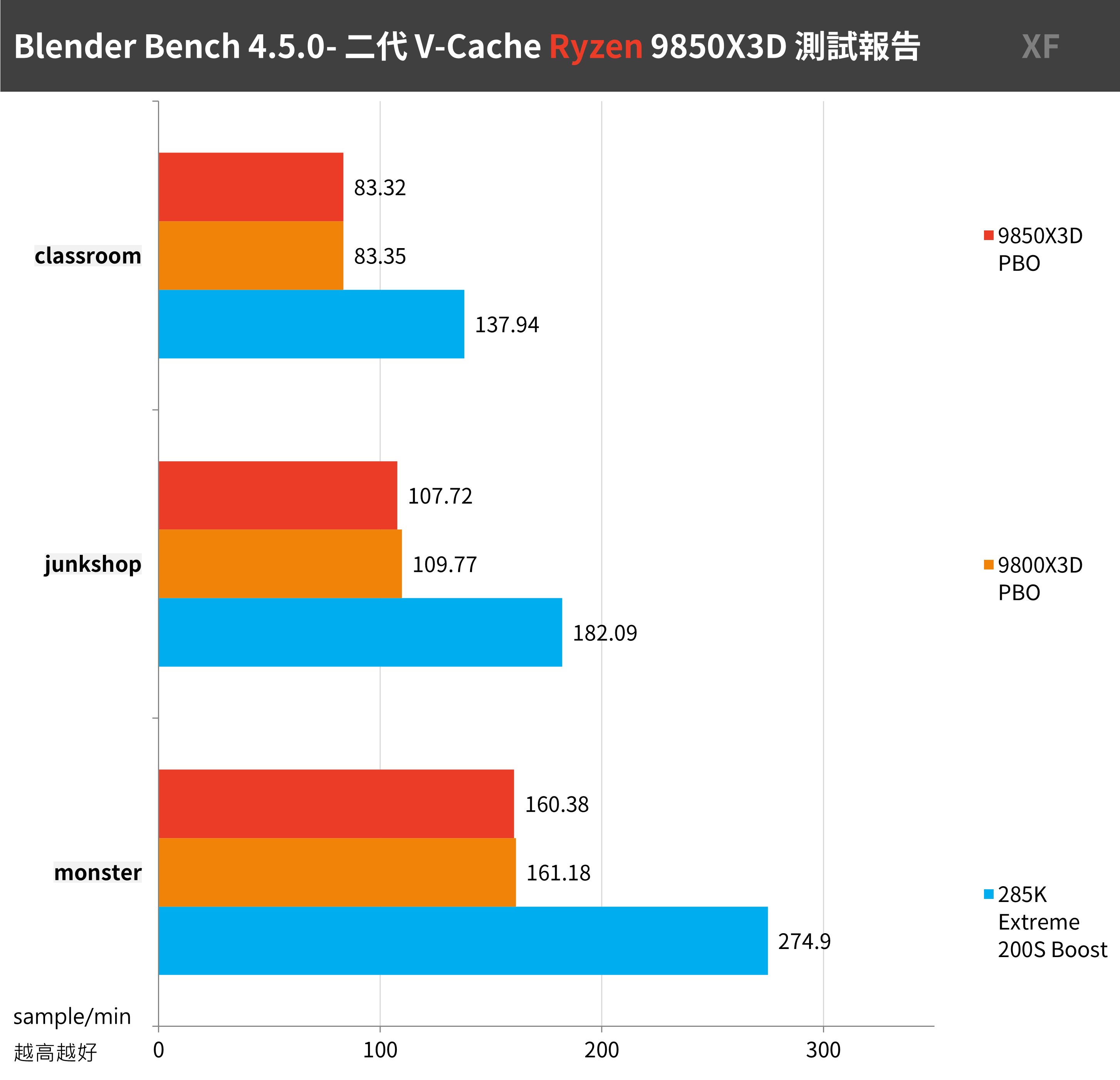 9850X3D 分別在 monster 場景 160.38、junkshop 場景 107.72、classroom 場景 83.32 的每分鐘採樣數量。多核心效能與 9800X3D 相同。