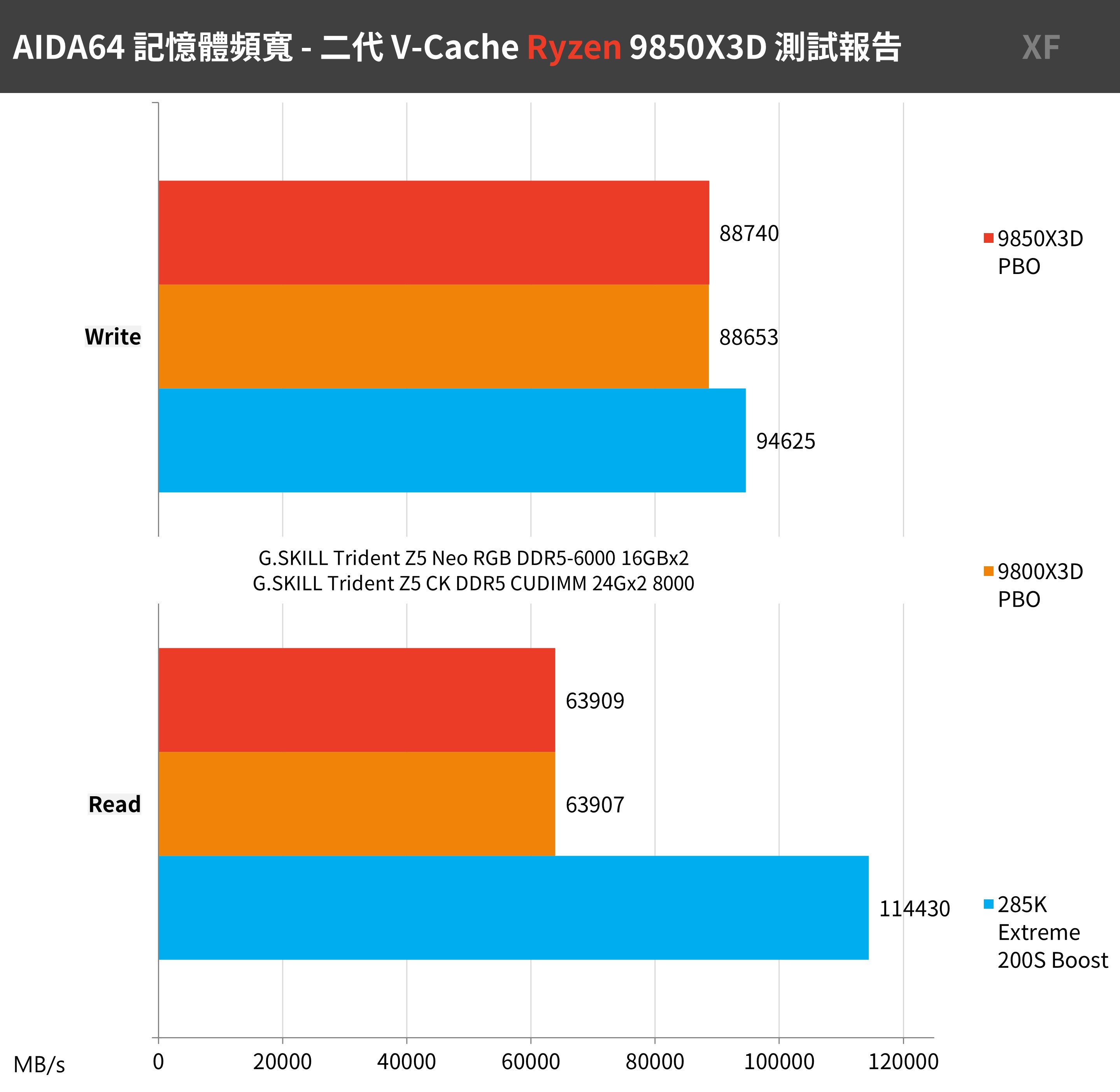 AIDA64 記憶體測試,這次 AMD 都使用 G.SKILL Trident Z5 Neo RGB DDR5-6000 16GBx2 記憶體、Intel 則是 G.SKILL Trident Z5 CK DDR5 CUDIMM 24Gx2 8200,並都開啟 EXPO 與 XMP 超頻參數。