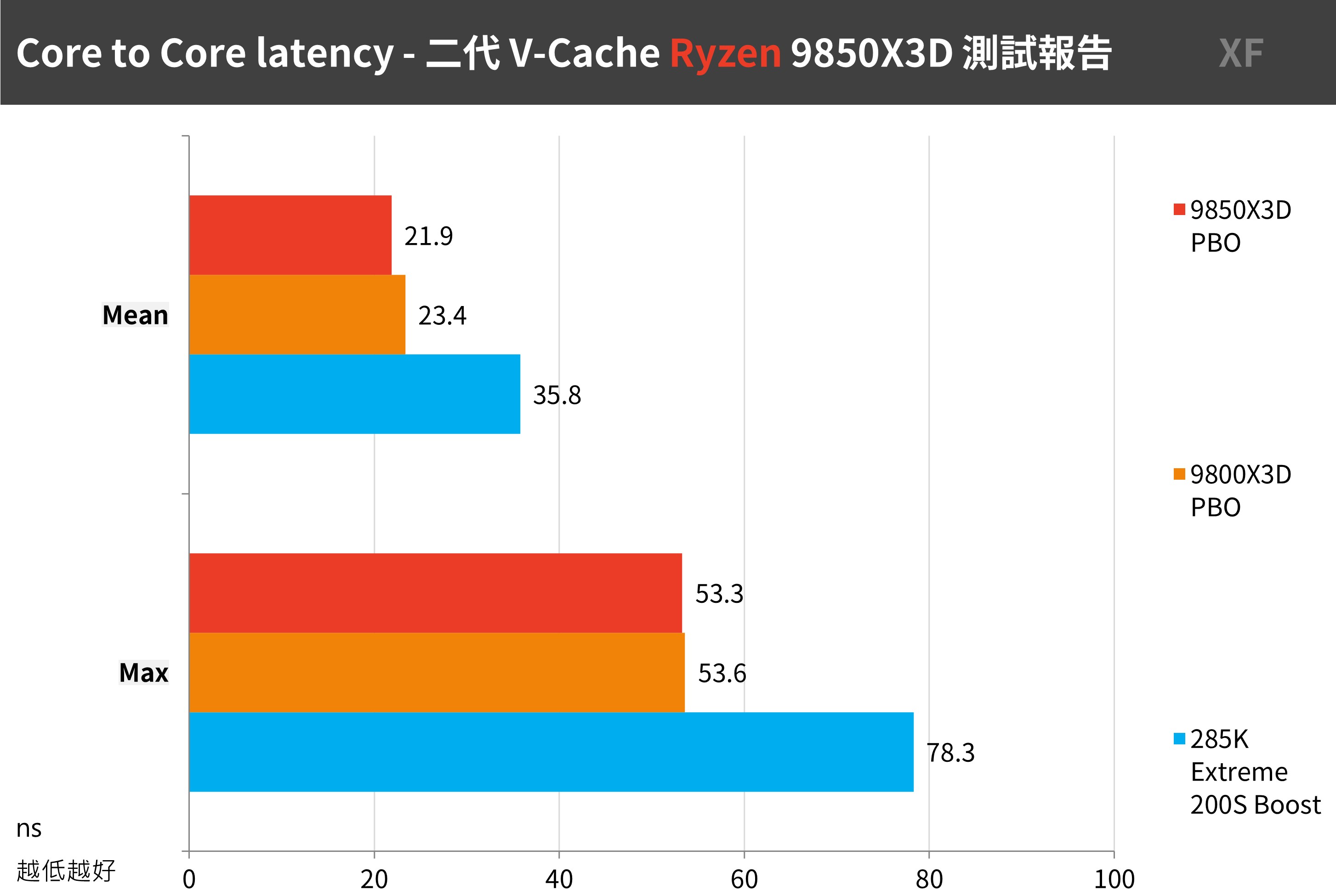 9850X3D 平均延遲是 21.9ns、最高 53.3ns;相較於 9800X3D 在平均延遲上有著較好的表現。但有趣的是相比 285K 多核心、不同架構下,核心數較少的 9850X3D 的 C2C 延遲相對低了一些。