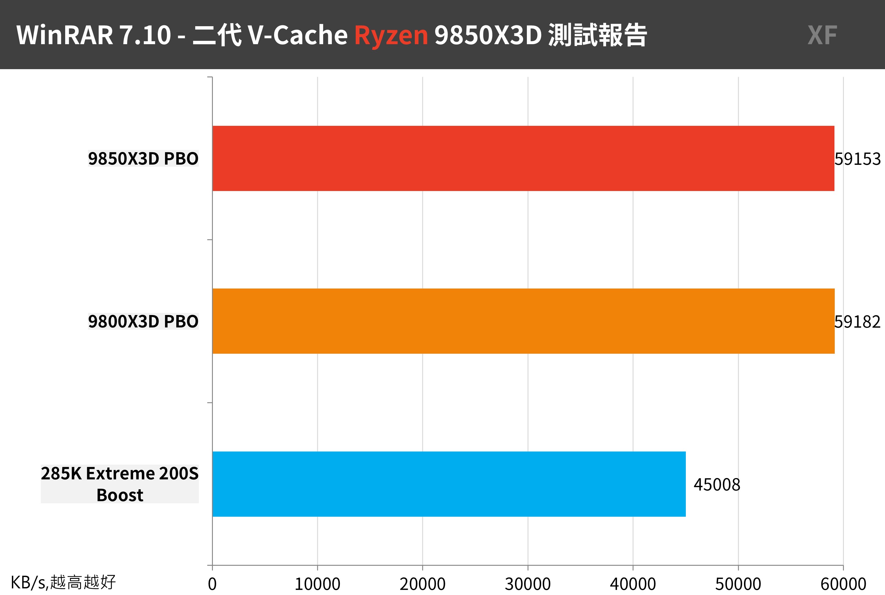 WinRAR 最常用壓縮工具,效能上 9850X3D 與 9800X3D 都可達到 59153 KB/s 的效能,這項目反而還贏過 285K。