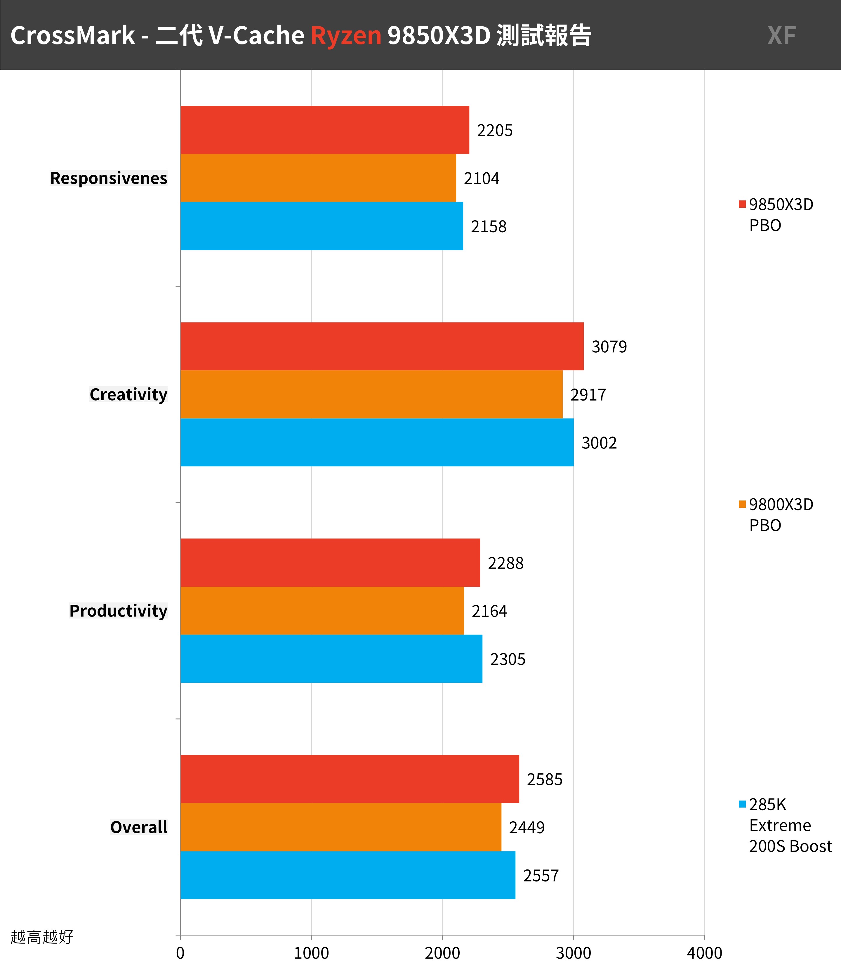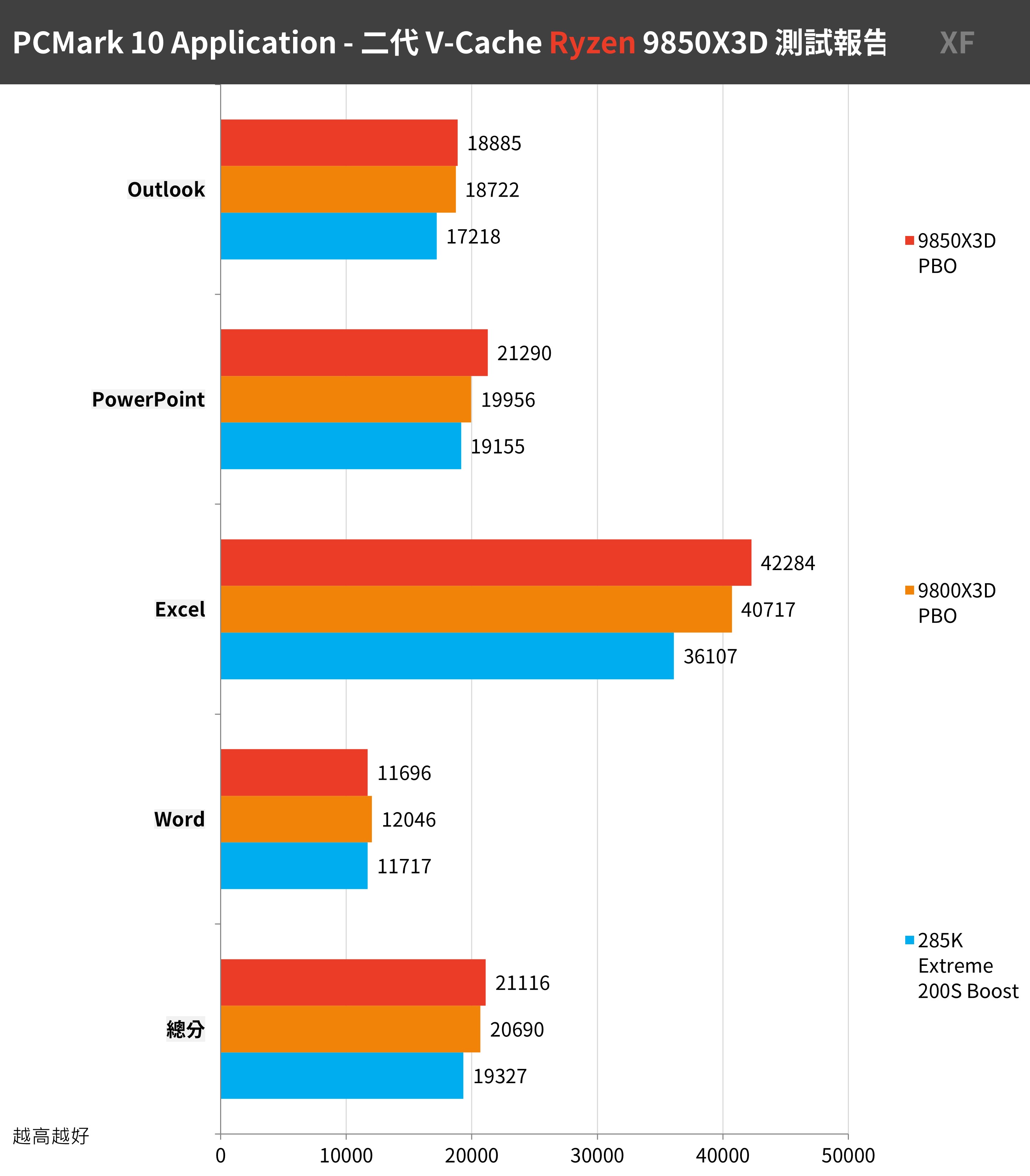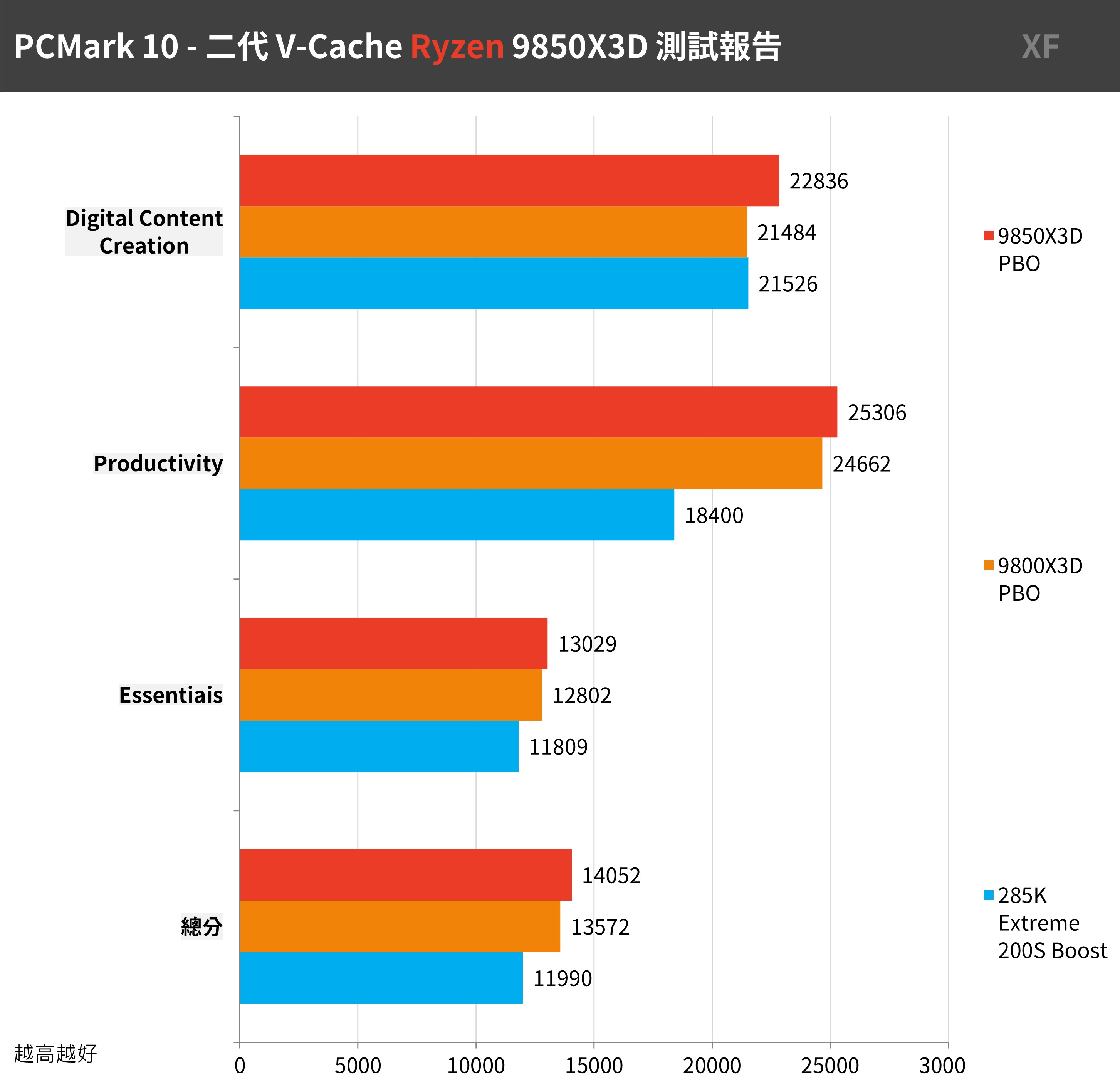 9850X3D 獲得最高總分 14052 分的成績,並在三個項目中都比 9800X3D 提升約 4% 的電腦整體效能;只不過這個測試情境下,285K 僅獲得 11990 分的成績。
