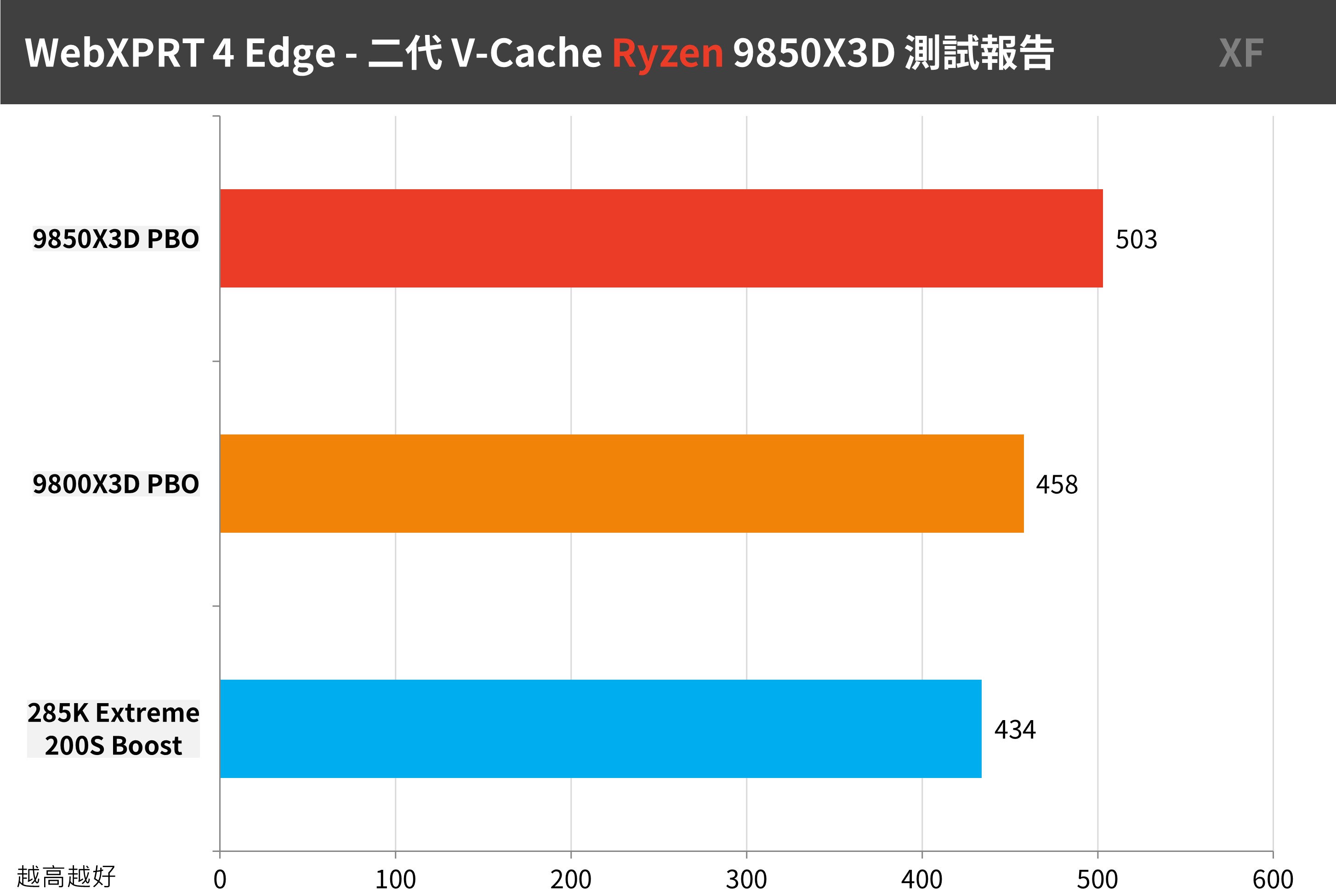 9850X3D 總分達到 503 分的成績,相比 9800X3D 提升約 10% 的瀏覽器處理效能,甚至比 285K 還要快 16%。