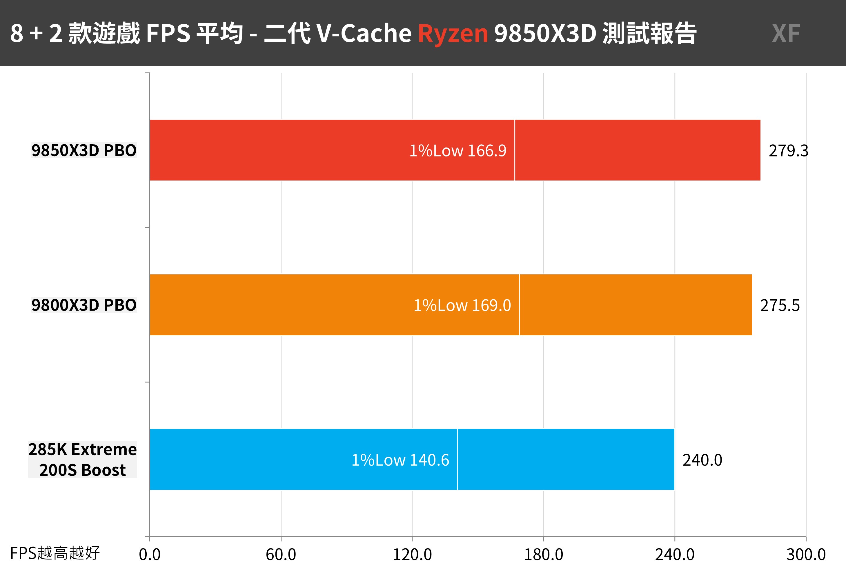 8 款 AAA 與 2 款電競遊戲中 9850X3D 總平均 279.3 FPS / 1%Low 166.9 FPS,至於 9800X3D 則是總平均 275.5 FPS / 1%Low 169 FPS,兩者再開啟 PBO +200MHz 後遊戲效能差異僅 1% 提升。至於相比 285K 總平均 240 FSP / 1%Low 140.6 FPS,則有著 16% 效能提升尤其 1%Low 成績有著 19% 提升。