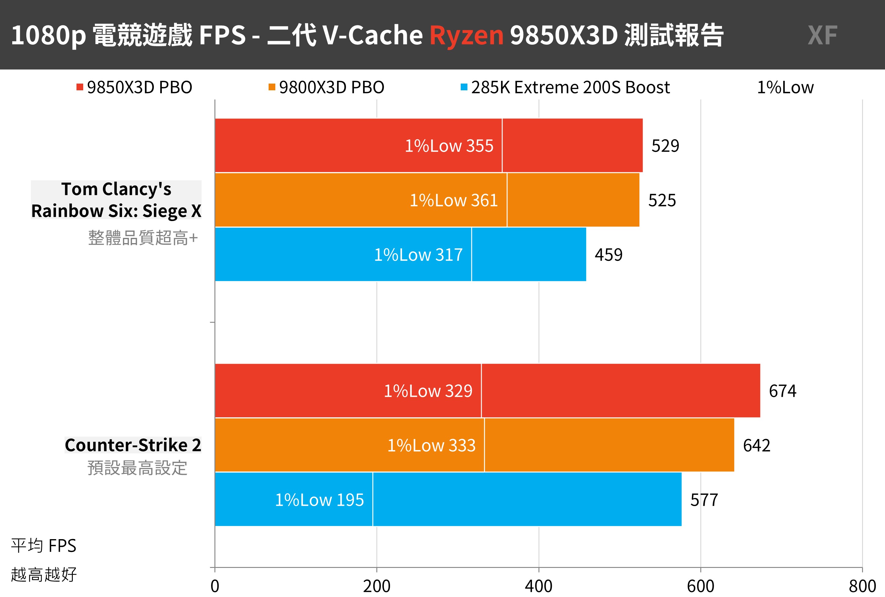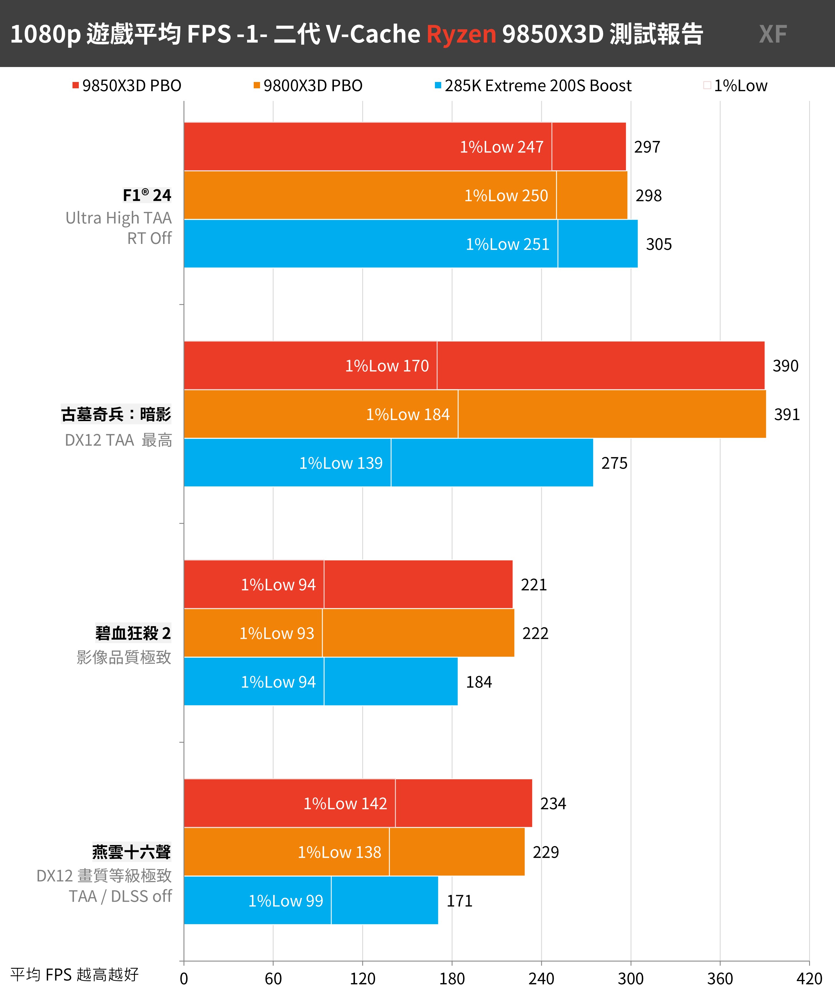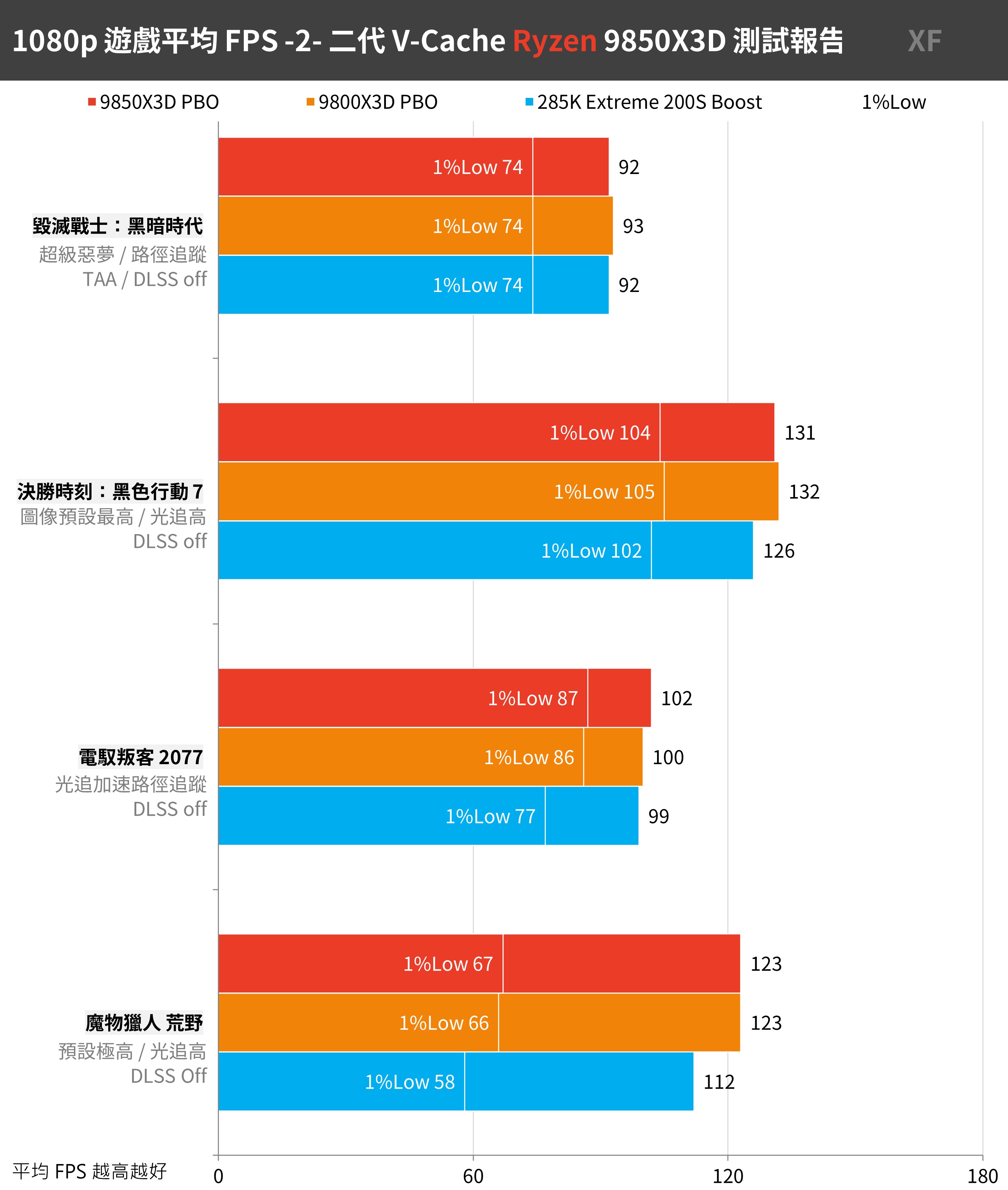 也就是說,盡可能降低 GPU 負載的情況下,9850X3D 與 9800X3D 能藉由大容量快取,讓遊戲在 1080p 解析度下輸出更高的 FPS。另外一點則是 9800X3D 設定「PBO +200MHz」後的效能真的是緊貼著 9850X3D。