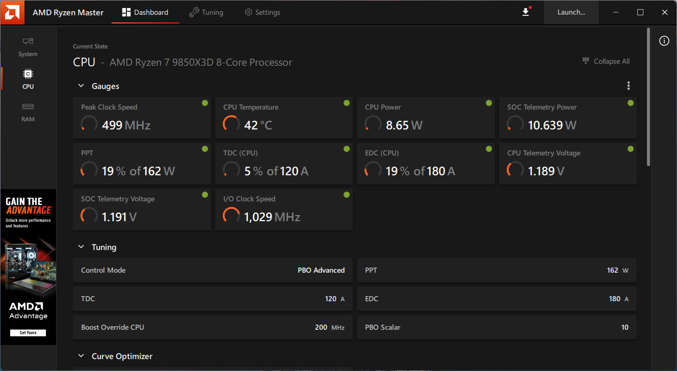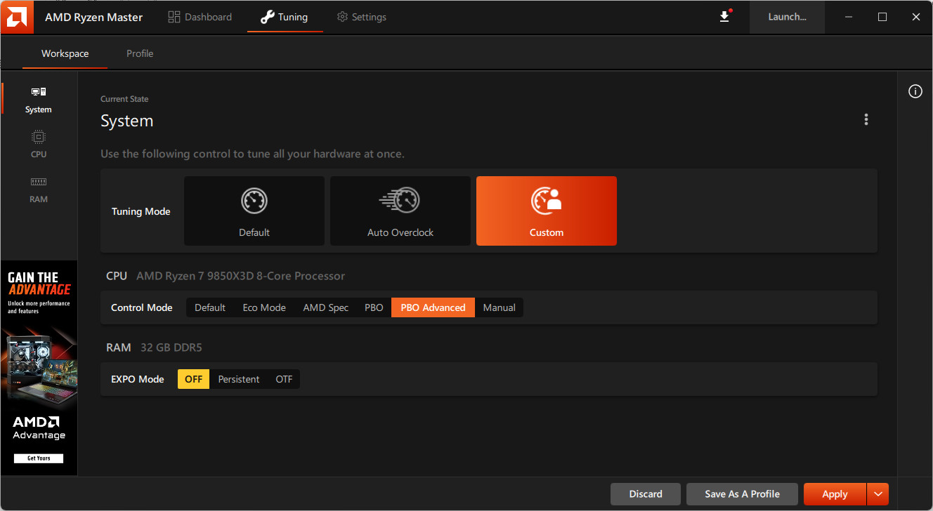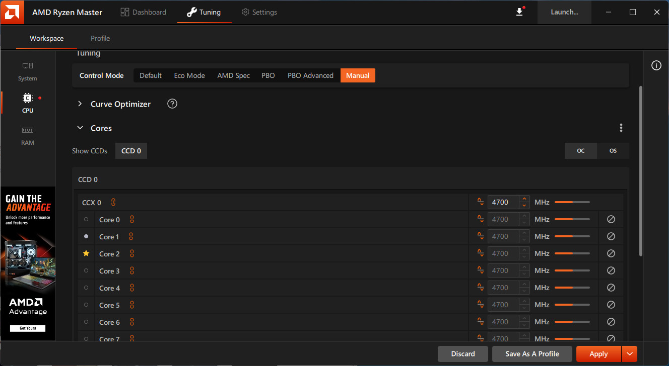 「Tuning」頁面在 System 層提供預設、自動超頻與自訂,而自訂就包含 AMD 提供的 Eco 模式、AMD Spec 官方設定、PBO、PBO Advanced 與全手動。而在手動設定中可針對每個核心調整時脈與電壓,讓玩家自行設定超頻參數。