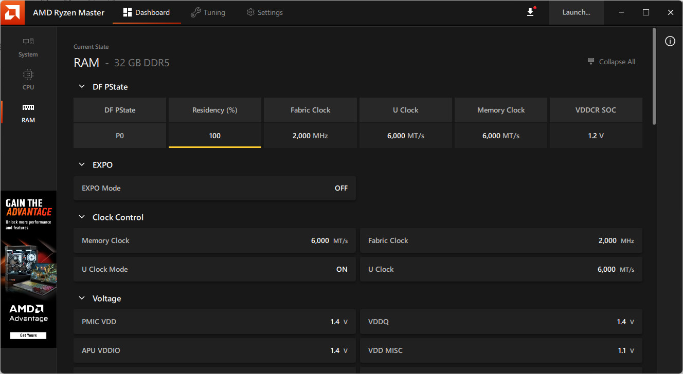 AMD Ryzen Master 有了全新的介面,在「Dashboard」可以檢視 System、CPU、RAM 等硬體監控資訊,以及詳細顯示 CPU 目前的控制(超頻)模式,以及主要的 PPT / TDC / EDC 等參數;而 RAM 也提供相當詳細的資訊。