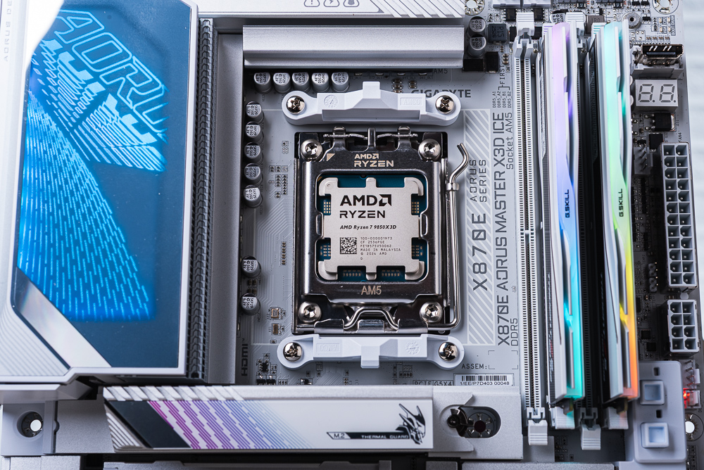 這次 AMD Ryzen 7 9850X3D 處理器測試,採用 GIGABYTE X870E AORUS MASTER ICE 主機板、G.SKILL Trident Z5 Neo RGB 記憶體與 SAMSUNG 9100 PRO 做為這次的測試平台。而這代 Ryzen 7 9850X3D 的外盒,一樣是原本的橘黑色外盒加上銀色的 3D V-Cache 塗裝。