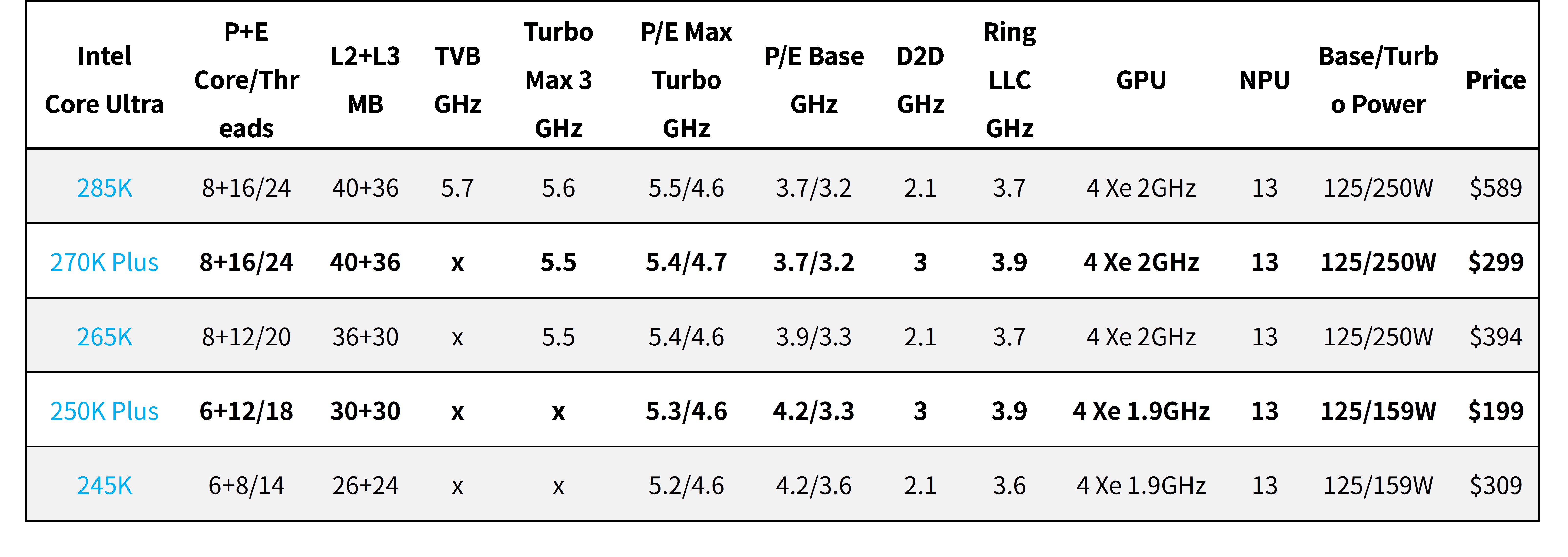 首先 270K Plus 核心數與 285K 看齊同樣 8P + 16E 的 24 核心,並微調時脈其餘規格則大致相同;至於 250K Plus 則是增加 E-core 數量的升級版,有著 6P + 12E 的 18 核心,並稍微提升處理器核心時脈,維持相同的 125/159W 預設功耗。而且 270K Plus 與 250K Plus,有著更高的 D2D 3GHz 與 Ring/LLC 3.9GHz 較高的內部時脈。