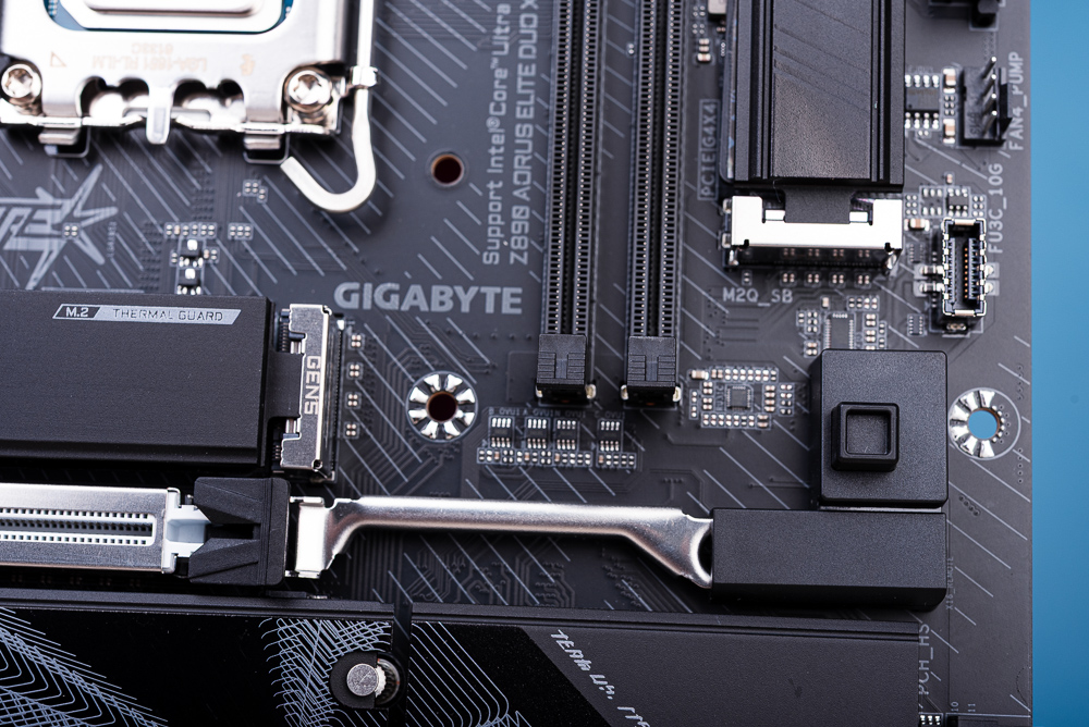 Z890 AORUS ELITE DUO X 有著 3 個 PCIe x16 插槽,可提供顯卡 PCIe 5.0 x16 擴充,同時第一根 PCIe 插槽採用金屬裝甲強化插槽的抗拉扯性,以及藉由 EZ PCIe 按鈕一按即可釋放顯卡,讓玩家在 DIY 拆裝顯卡時更便利。