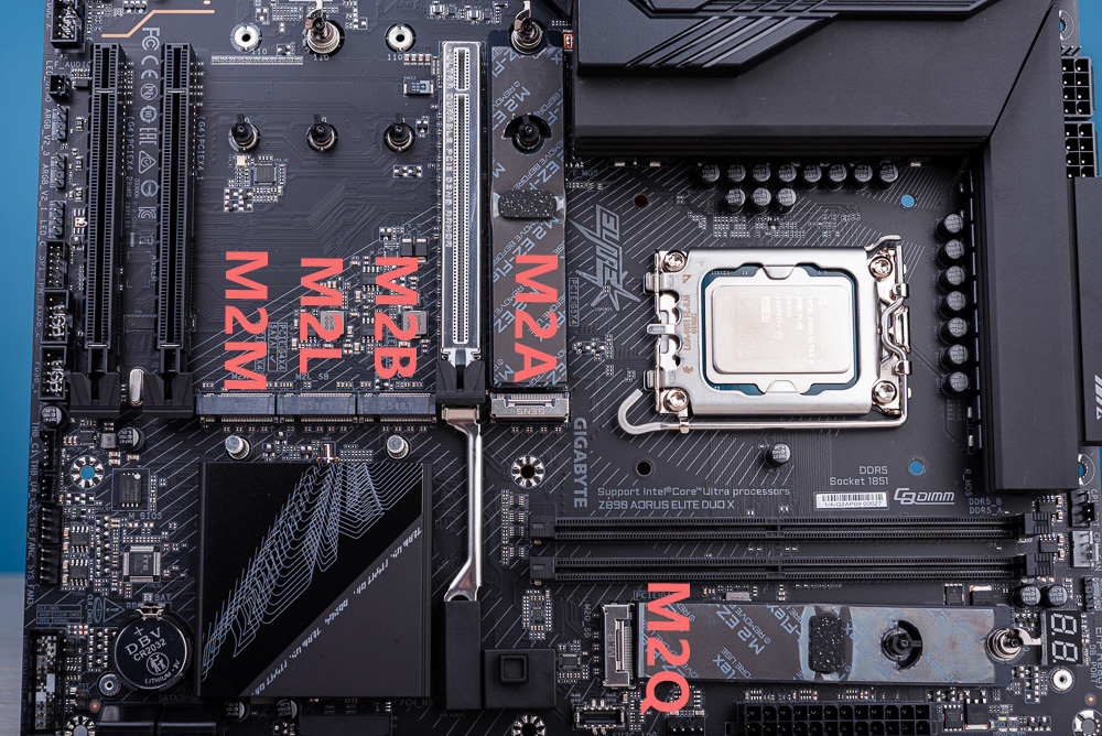 主板除了具備 4 個 SATA 擴充外,板子還有著 5 個 M.2 擴充,依序為 M2A_CPU 與 M2B_CPU 都採用 CPU 的通道,M2A_CPU 支援 PCIe 5.0 x4 頻寬而 M2B_CPU 則是 PCIe 4.0 x4 頻寬。至於 M2L_SB、M2M_SB 與 M2Q_SB 都採用晶片組的 PCIe 4.0 x4 通道。