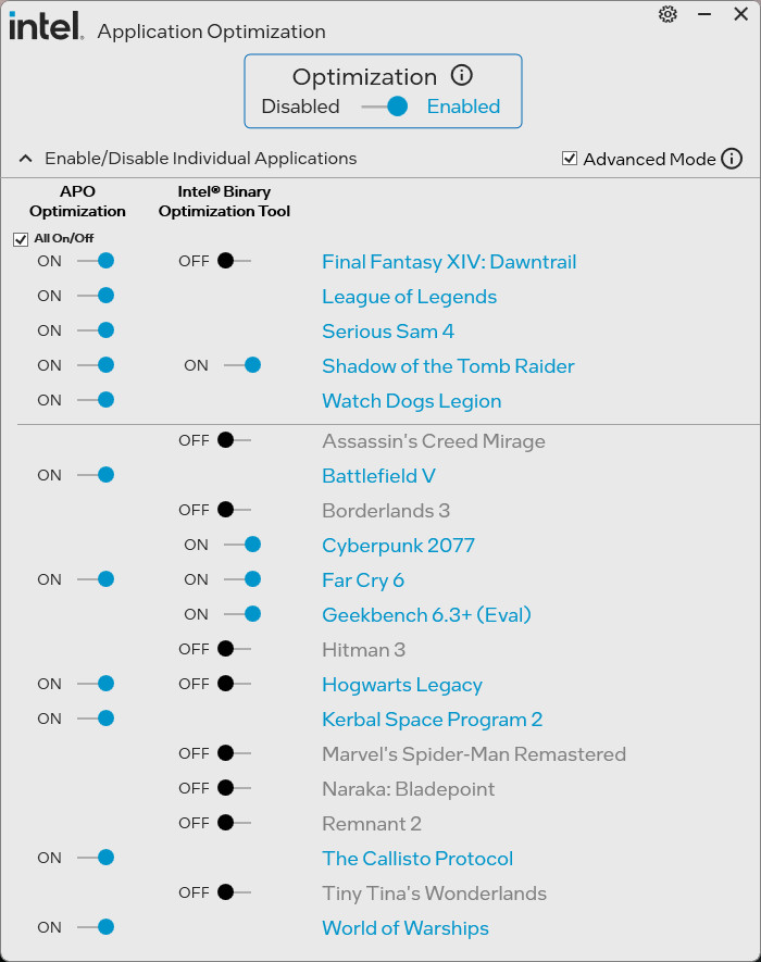 這功能玩家只要安裝好 IPPP 並開啟 APO 軟體,預設 APO 會被設定為「Enabled」,並勾選 Advanced Mode 後,可以檢視所有支援 APO 與 Binary Optimization 的遊戲或者是應用。玩家可自行調整 APO 設定,但 On/Off 切換後需重新起動電腦才會生效。