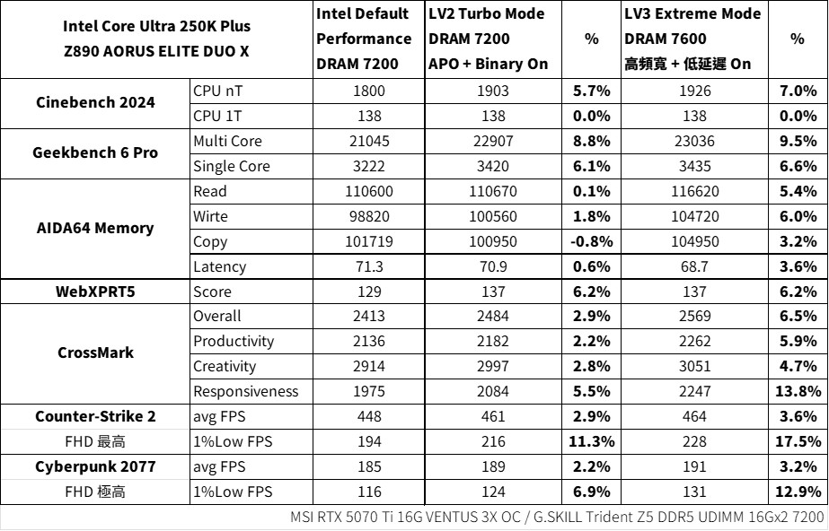 250K Plus 在主板預設下獲得多核心 21045 分、單核心 3222 分的成績;LV2:Turbo Mode 並開啟 APO 與 Binary 優化,多核心提升至 22907 分(8.8%)、單核心 3420 分(6.1%);而在最終超頻 LV3:Extreme Mode 下,多核心提升至 23036 分(9.5%)、單核心 3435 分(6.6%)的性能升級。