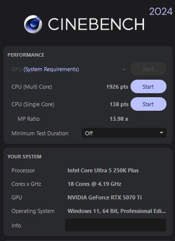 首先 Cinebench 2024 測試,在主板預設 Intel Default Performance 與 DRAM 7200 設定下,250K Plus 獲得 CPU nT 1800 pts、1T 138 pts 的成績;緊接揭開起 LV2:Turbo Mode 與最大處理器效能下,nT 多核心獲得 5.7% 提升達到 1903 pts 的成績;最終 LV3:Extreme Mode 與 DRAM 7600 超頻設定下,CPU nT 達到 7% 提升獲得 1926 pts 的成績。