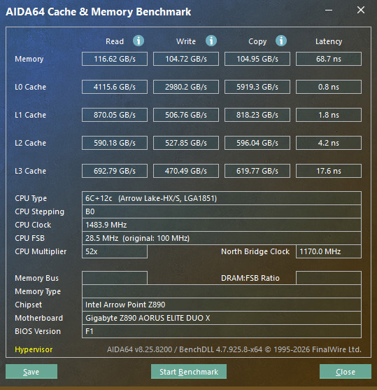 測試記憶體使用 DDR5 UDIMM 16Gx2 7200,預設上 250K Plus 有著不錯的記憶體性能,而在最終 LV3:Extreme Mode 超頻與手動調整記憶體時脈至 7600 MT/s 並開啟高頻寬與低延遲功能,記憶體讀取達到 116620 MB/s、寫入 104720 MB/s、複製 104950 MB/s、延遲 68.7 ns 的效能表現,記憶體讀取提升 5.4%、寫入提升 6.0%、延遲降低 3.6%。