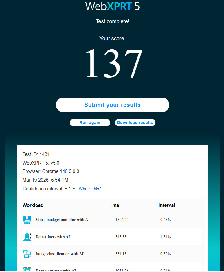 WebXPRT 5 測試,使用 Edge 瀏覽器測試基於 HTML5、JavaScript 和 WebAssembly 的網頁工作,包含 AI 視訊背景模糊、AI 人臉偵測、AI 影像分類、AI 文件掃描、照片特效、學校科學專案以及家庭作業拼字檢查。