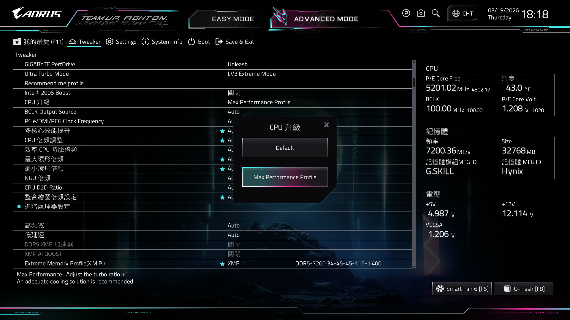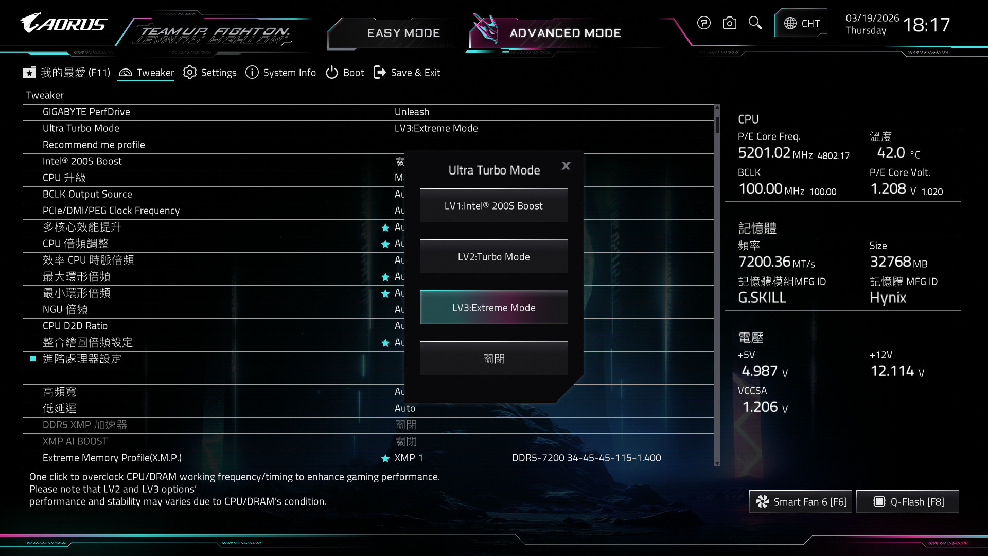 主機板 BIOS 設定中,在 Tweaker 超頻設定頁面有著「Ultra Turbo Mode」,提供 LV1:Intel 200S Boost、LV2:Turbo Mode 與 LV3:Extreme Mode 等三檔快速超頻設定,讓玩家可快速調整所需的超頻功能,並可將 CPU 升級設定為最大效能設定檔。