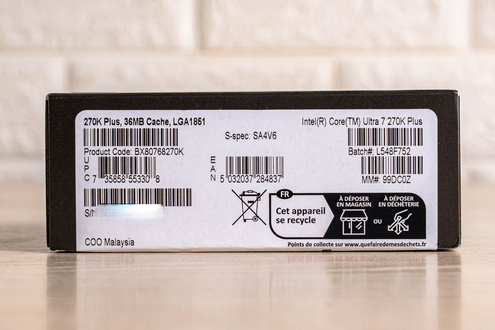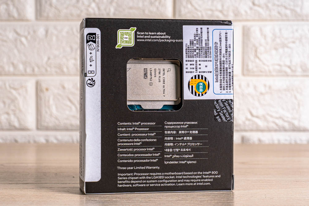 主角登場! Intel Core Ultra 7 270K Plus 桌上處理器,延續以往的簡潔包裝,其正面有著 270K Plus LGA 1851 明確標示;而包裝背面,延續開有方形孔來顯露 CPU 頂蓋,方便玩家確認處理器型號,以及配有代理貼紙,讓玩家知悉保固出處。