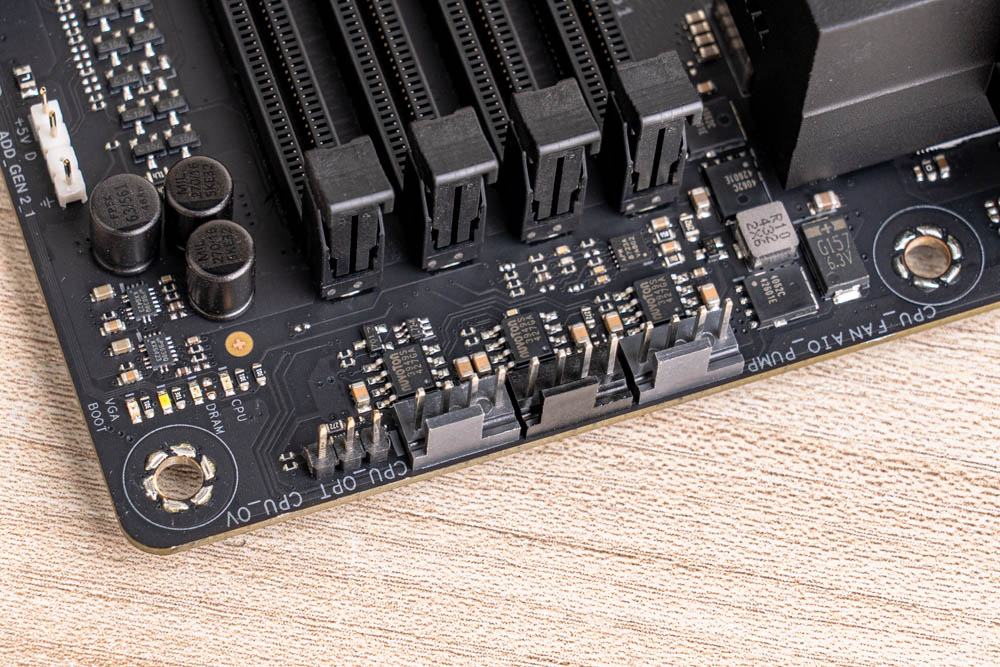 主板右上區域,提供雙通道 4 DIMM DDR5記憶體插槽,支援最大256GB容量,有著高達 9066+ (OC) MT/s 超頻能力;並設有 3 個 PWM/ DC 4-Pin 風扇擴充,以及 DIY 友善的 Q-LED 燈號,方便玩家安裝散熱,與故障檢測。