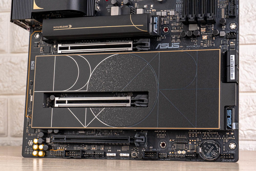 ProArt Z890-CREATOR WIFI 下半區域,提供2 根 PCIe 5.0 x16 插槽,採用 SafePlot 金屬外框加固,以及 PCIe Slot Q-Release Slim 自動退卡設計,支援 PCIe 5.0 x16 與雙8x / 8x 的頻寬分配;並配有 1 根 PCIe 4.0 x16 插槽,支援 PCIe 4.0 x4頻寬,可滿足玩家雙顯卡、各式介面卡擴充的使用需求。