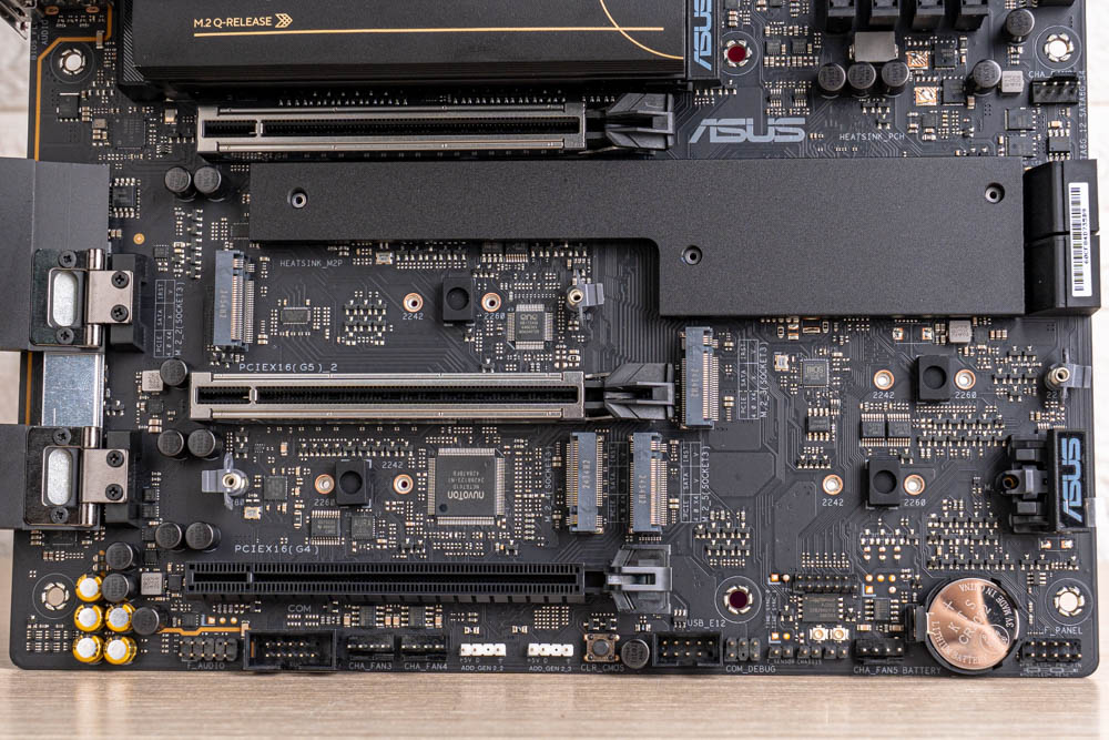 而 M.2 儲存,提供有 5 個 M.2 擴充,由上而下依序為,搭載獨立散熱器的M.2_1 插座,支援目前主流的 PCIe 5.0 x 4 頻寬;其次為大面積散熱片的M.2_2、M.2_3、M.2_4、M.2_5 插座,皆支援 PCIe 4.0 x4 頻寬;其中 M.2_5 則與底部 PCIe 4.0 x16 插槽,共用通道頻寬。