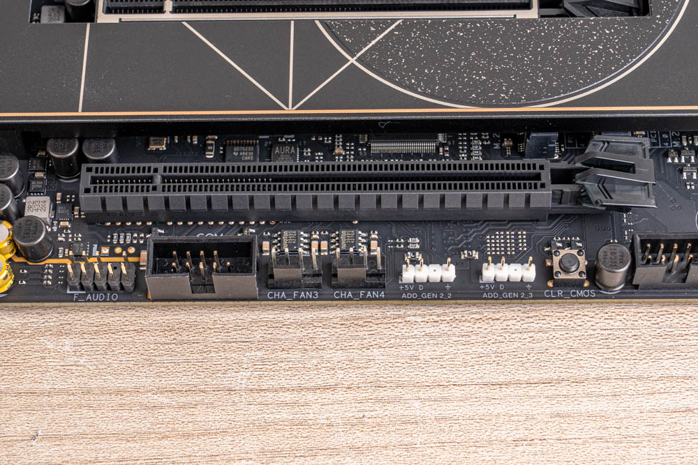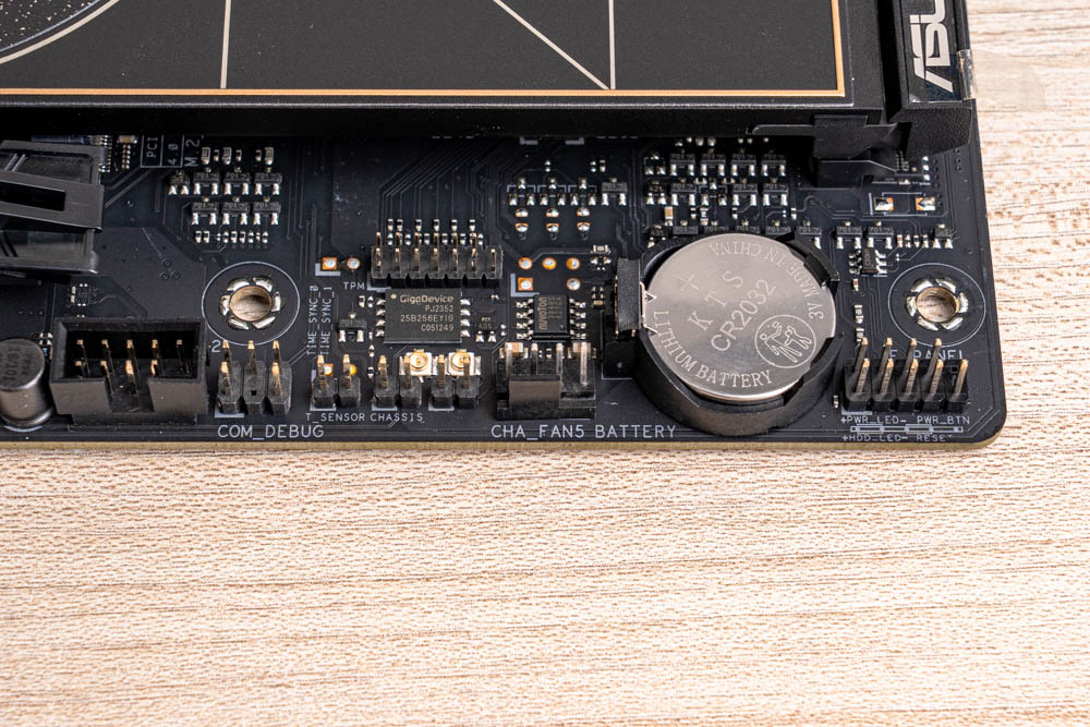 而主板右側,則有著主板供電 ATX 24-Pin、ARGB 3-Pin,以及前置 USB-C 20Gbps 與USB-A 5Gbps 等高速連接埠;並且提供 4 個 SATA 擴充;此外,還設有 ASUS 標示的M.2 Q-Release按鈕,可讓玩家免工具的一鍵釋放 M.2 散熱片。