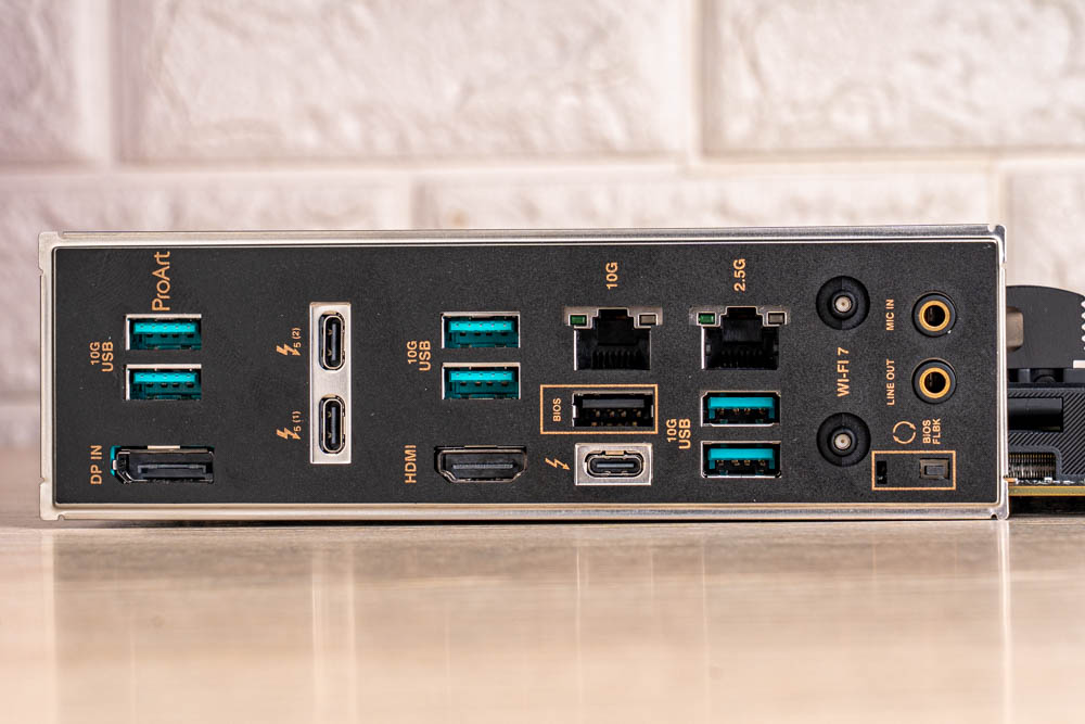 一體式後 I/O 背板,提供 6 個 USB-A 10Gbps (藍綠色)、1個 USB2.0 (黑色),以及 2 個 Thunderbolt 5、1個 USB4 Type-C等USB連接埠,搭配前置USB擴充,共有 15 個 USB 可供使用;顯示輸出端,則包括 Thunderbolt 5、USB4 Type-C與HDMI 2.1 共計 3 個內顯輸出;其次DisplayPort 僅供輸入。