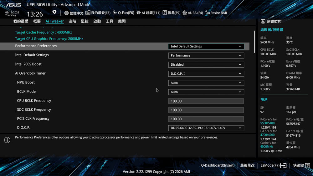 ↑ BIOS 設定一,保持 CPU 功耗預設,僅開啟 XMP 記憶體超頻設定 (DOCCP 1 6400 MT/s)。