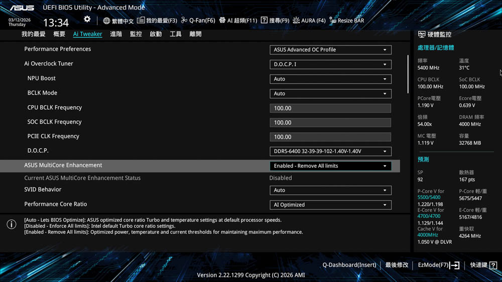 ↑ BIOS 設定二,以 ASUS MultiCore Enhancement的 Remove All limit 設定,解鎖功耗限制。