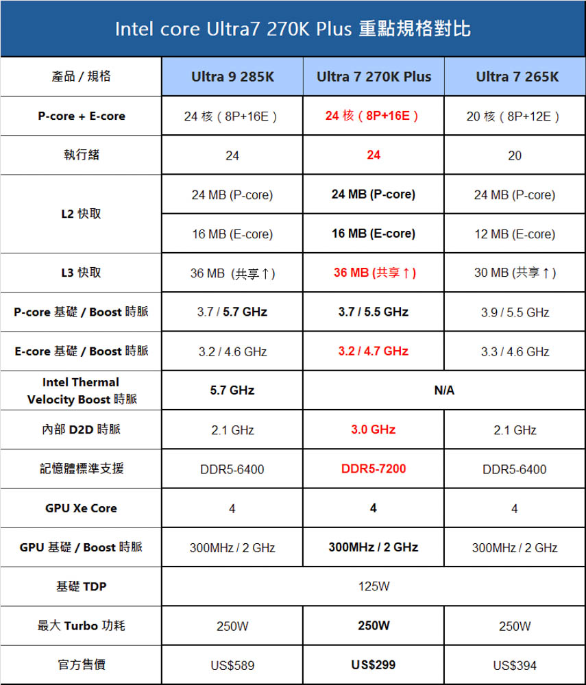 ↑ Intel Core Ultra 270 Plus、265K與 Ultra 9 285K 超頻處理器規格對照。