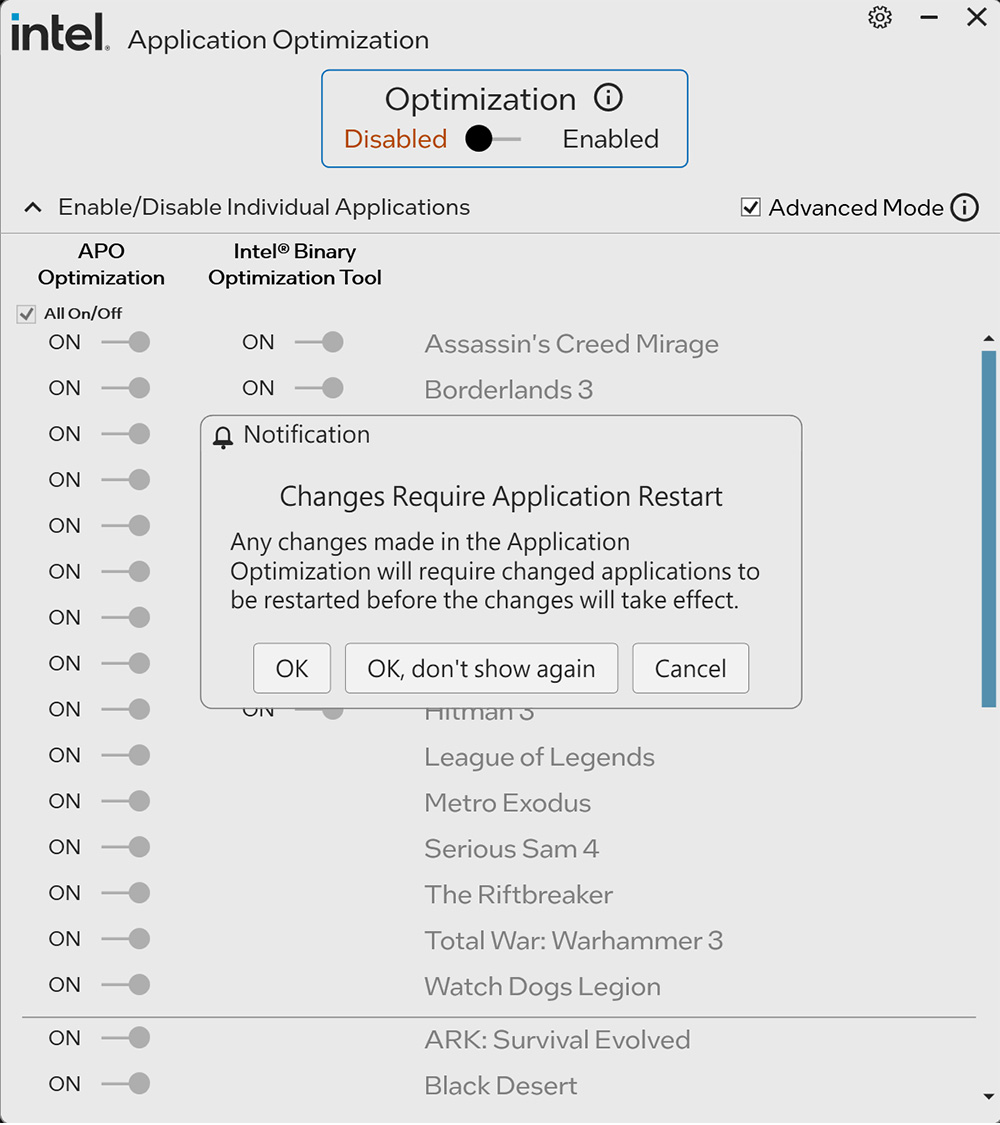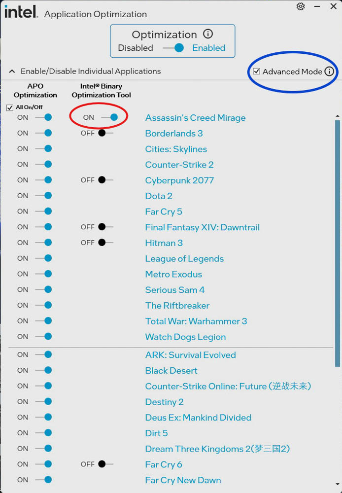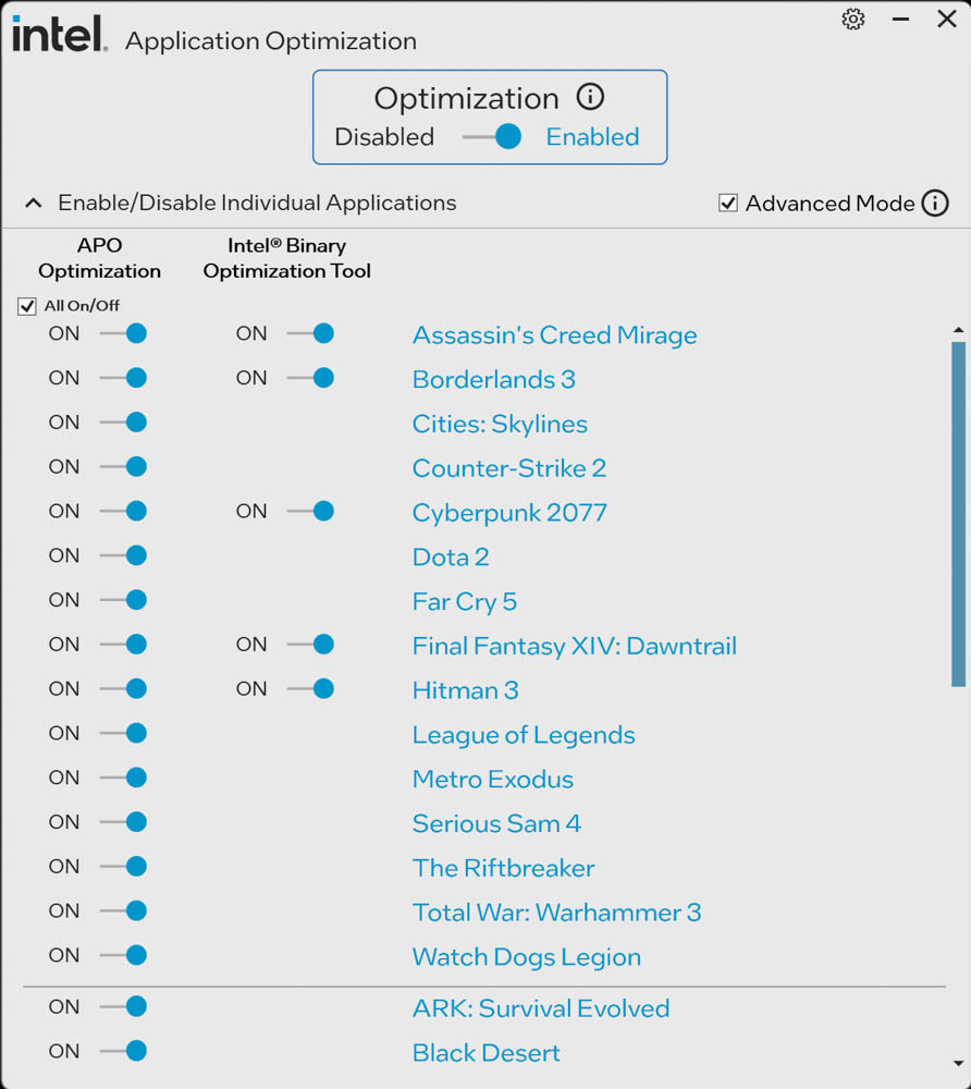 目前 Intel Binary Optimization Tool 支援 13 款遊戲軟體,作為首發陣容,供玩家們使用體驗;而使用方式,僅需安裝 IPPP 套件後,開啟 APO 最佳化介面,勾選高級模式,即可看見Binary Optimization Tool 該功能欄位,以及各款已支援遊戲軟體的啟動開關,讓玩家自行選用。