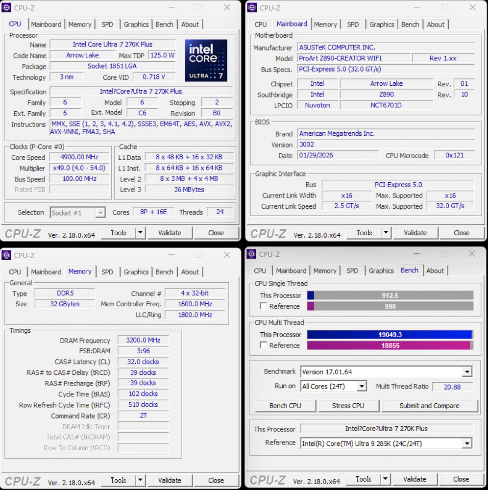 首先透過CPU-Z 驗明正身,Intel Core Ultra 7 270K Plus 資訊,代號 Arrow Lake,腳位封裝 LGA 1851,具備 8P + 16E 的 24 核心 24 執行緒,搭配 ASUS ProArt Z890-CREATOR WIFI 主機板、BIOS 版本 3002,記憶體則為DDR5 16GBx2 6400。