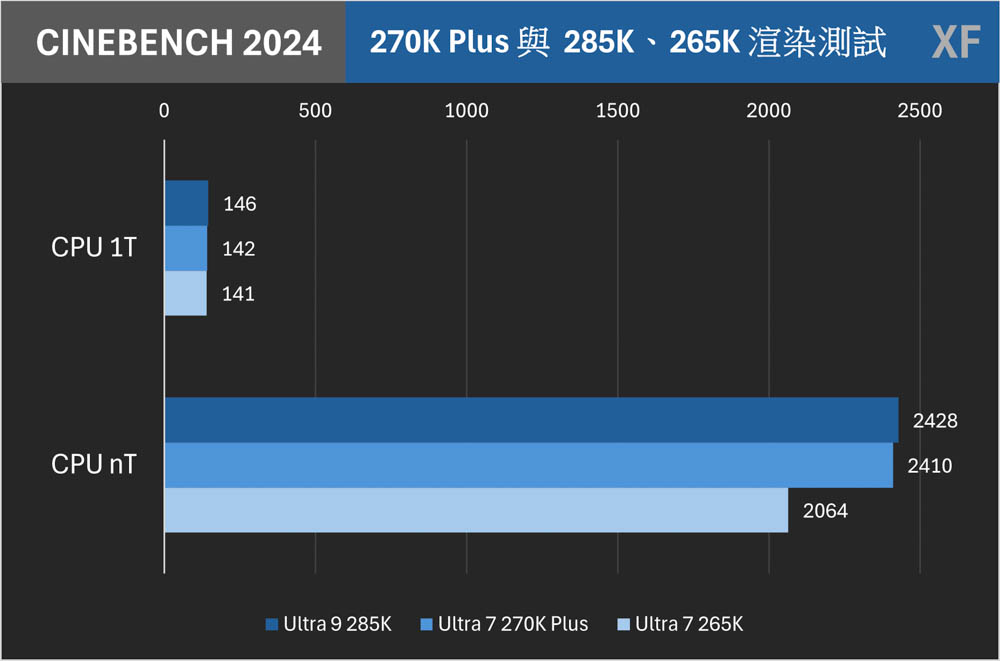 Intel Core Ultra 7 270K Plus 以預設功耗下,在Cinebench 2024 版本中,成績結果為CPU nT 2410 pts、1T 142 pts;相對同級265K 的 CPU nT 2064 pt,有著更好多核心處理能力,並緊追 285K CPU nT 2428 pts 的多核成績;單核心方面,基本相差不大,270K Plus 1T 142 pts 僅略輸 285K 1T 146 pts。