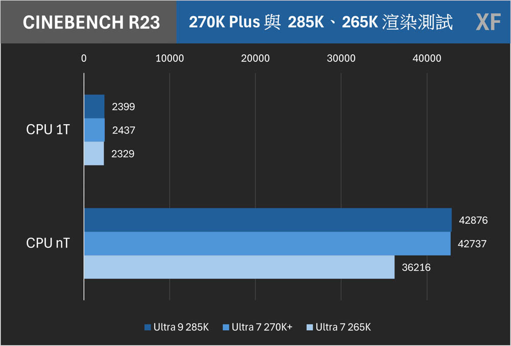 同樣的 270K Plus 於CINEBENCH R23 測試,獲得 CPU nT 42737 pts、1T 2437 pts 成績表現;基本與 285K 不分上下;相較同級 265K 處理器,有著多核 CPU nT 18 %、單核 CPU 1T 4.6 % 的效能提升。