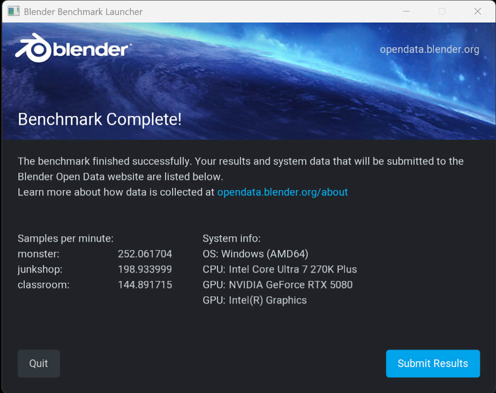 Intel Core Ultra 7 270K Plus在解除功耗限制,並啟用AI Optimized 超頻設定下,以 Blender 5.0 版本實測,獲得 monster 場景 252.06、junkshop 198.93 與classroom 144.89 的成績表現。